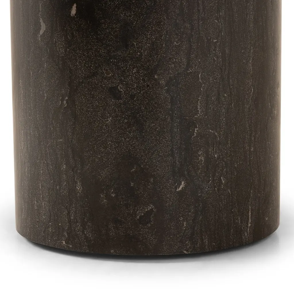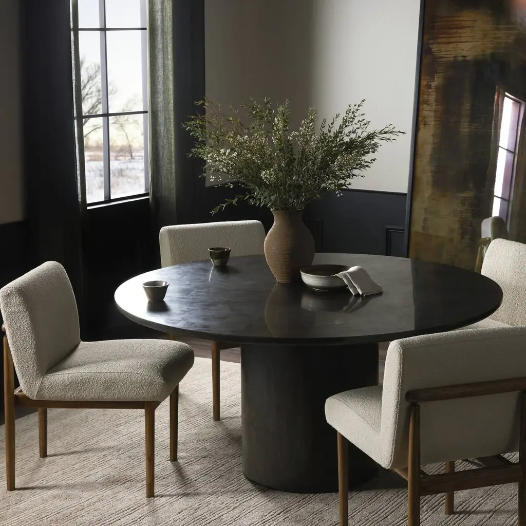 A statement in bluestone, this dining table showcases a simple cylinder base with a round tabletop. Style in a dining room or entryway.