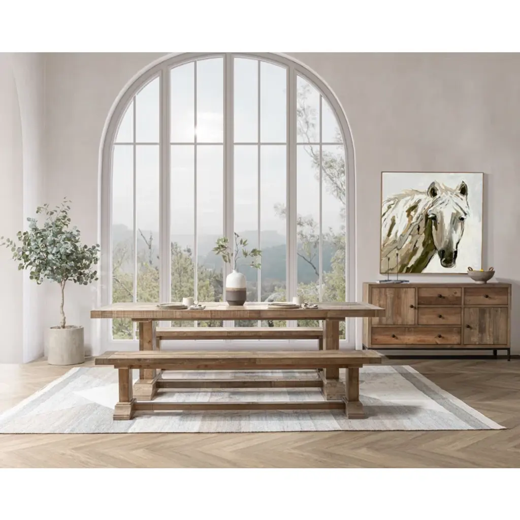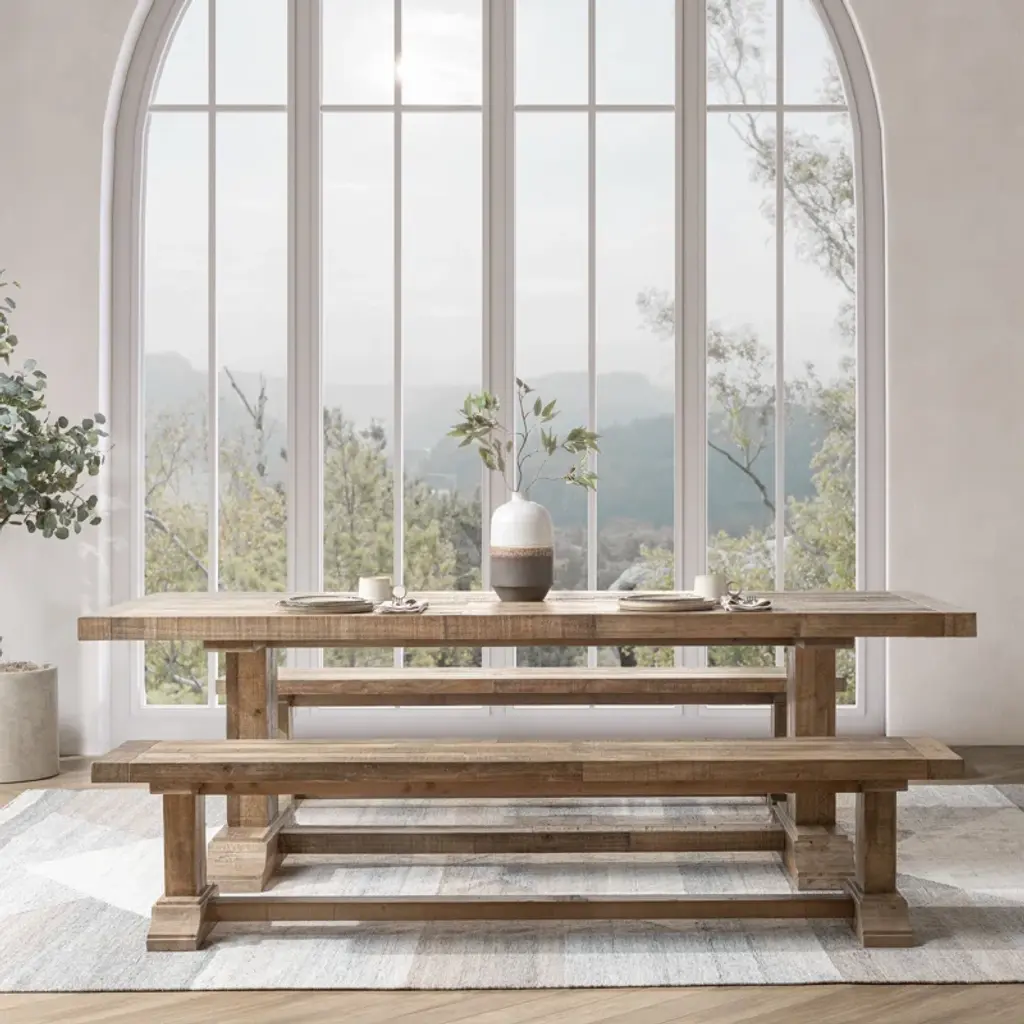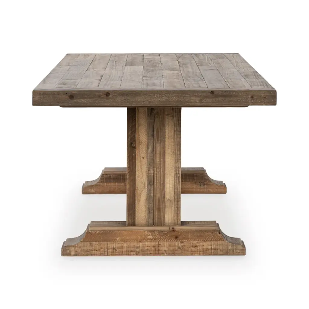 Crafted from reclaimed pine, this dining table exudes rustic charm with its hand-finished plank-style top, showcasing natural grain and character-rich imperfections. The sturdy pedestal base provides both stability and timeless elegance, making it a perfect centerpiece for gatherings. Sustainable and stylish, this table blends farmhouse warmth with modern durability, ensuring a unique and inviting dining experience for years to come. Ideal for cozy family meals or entertaining guests.