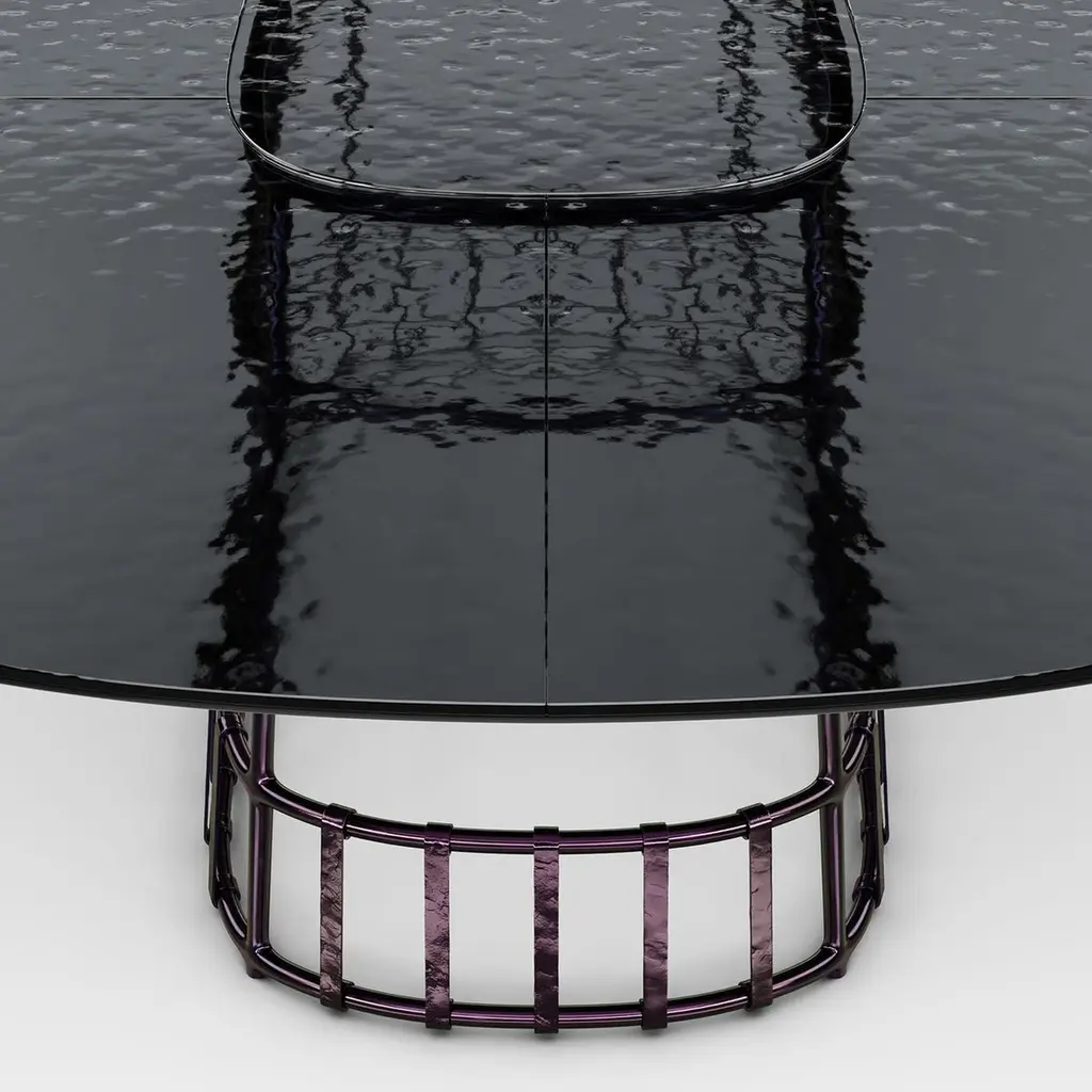 Exuding a raw and singular flair, this gorgeous dining table is a refined showcase of traditional craftsmanship. Designed by creative director Margherita Rui for Dante Negro's master metalworkers, it is handmade of metal lacquered in a mirrored purple shade, completed with a smokey glass top. Please consult the Artemest catalog for other designs from this series.