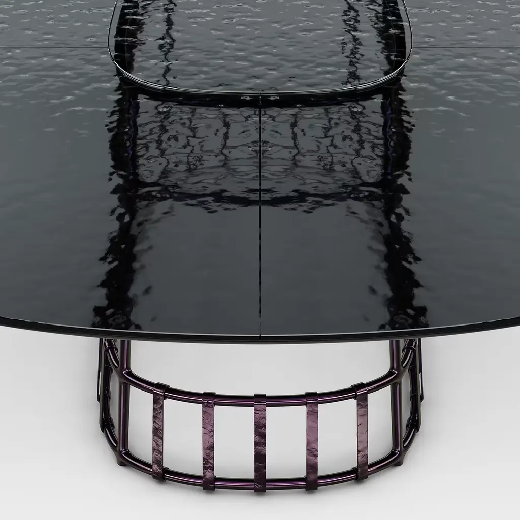 Exuding a raw and singular flair, this gorgeous dining table is a refined showcase of traditional craftsmanship. Designed by creative director Margherita Rui for Dante Negro's master metalworkers, it is handmade of metal lacquered in a mirrored purple shade, completed with a smokey glass top. Please consult the Artemest catalog for other designs from this series.