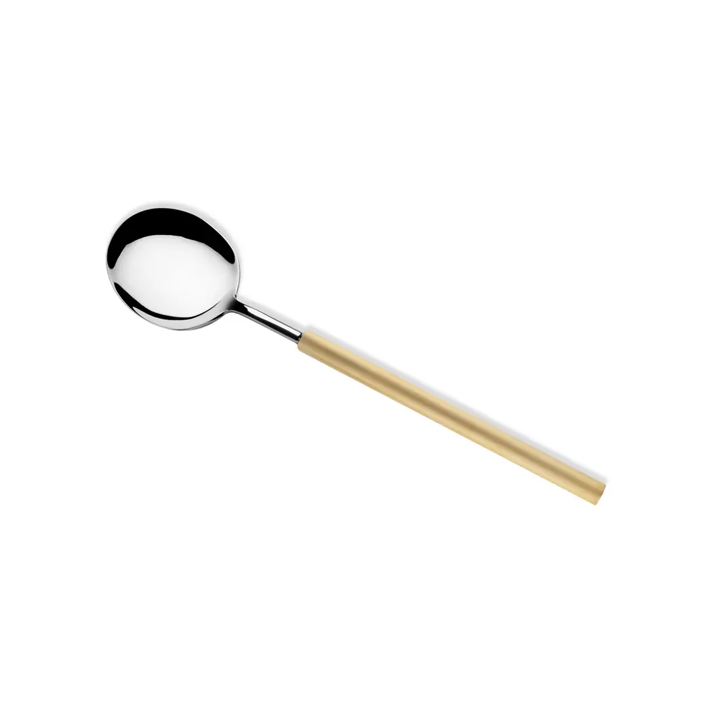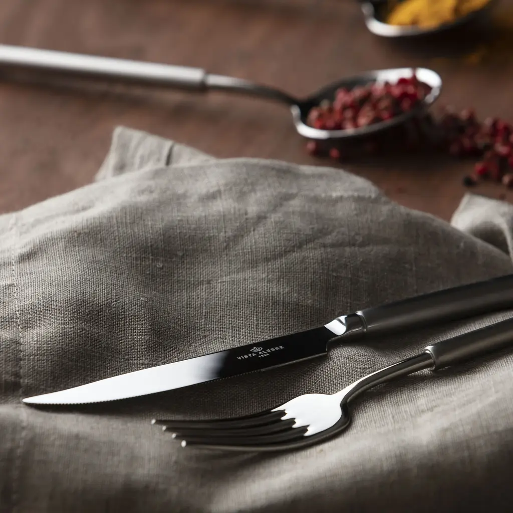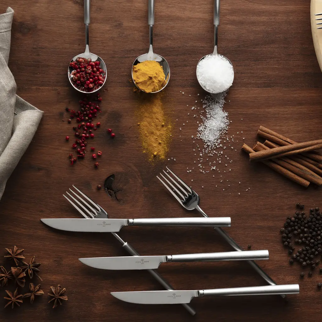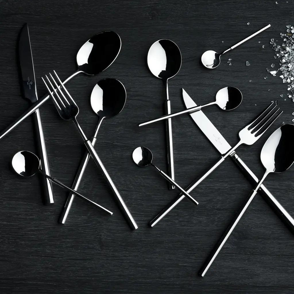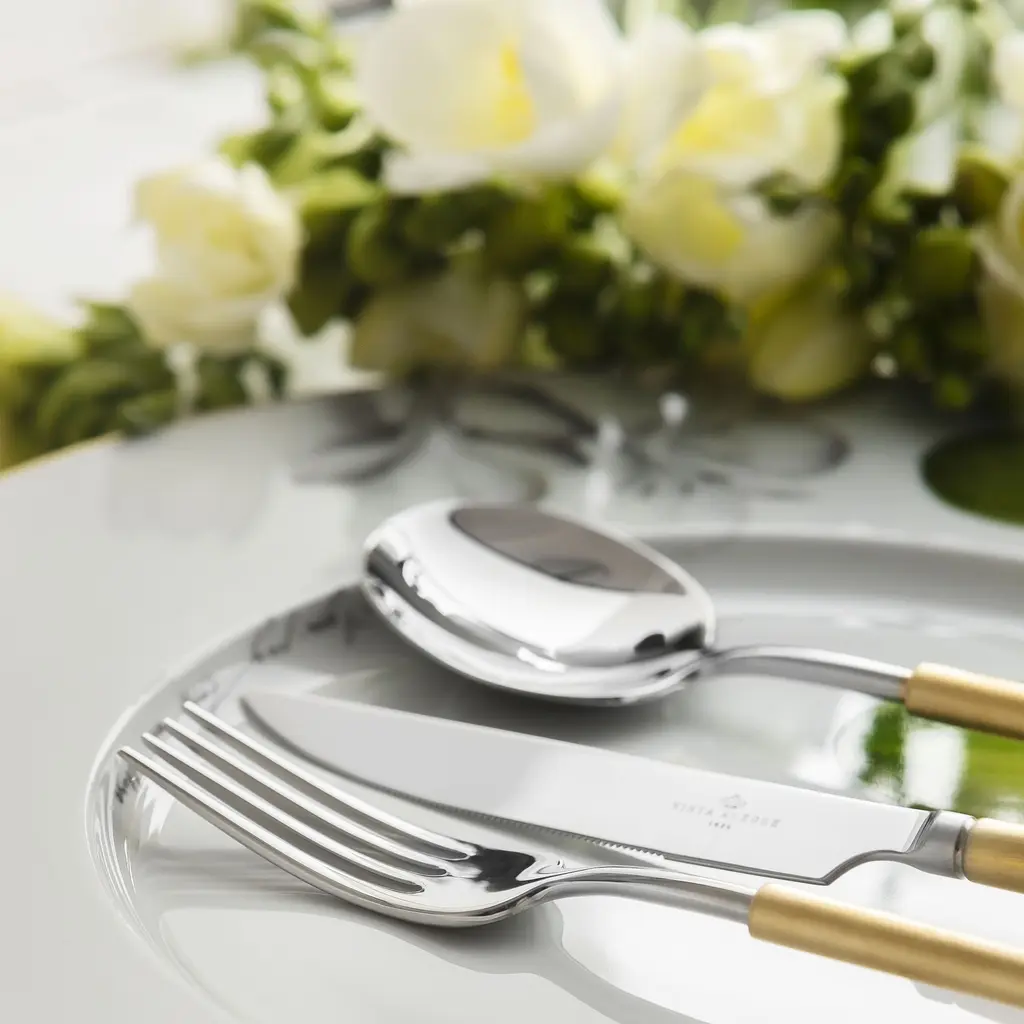 Domo flatware is a line of silverware produced by Vista Alegre, a renowned Portuguese brand known for its fine porcelain, crystal, and glassware. The Domo flatware collection boasts a contemporary and minimalist design, characterized by sleek lines and a flawless finish. The Domo flatware collection includes an array of utensils, such as dinner forks, salad forks, knives, teaspoons, tablespoons, and dessert spoons. The pieces are available in sets that cater to different dining needs, from intimate family dinners to large gatherings. Moreover, the collection offers three finishes to choose from, namely polished, matte, and matte gold, allowing customers to select their preferred style and design. Overall, the Domo flatware collection is an ideal choice for those seeking an elegant and practical silverware collection that will last for years.