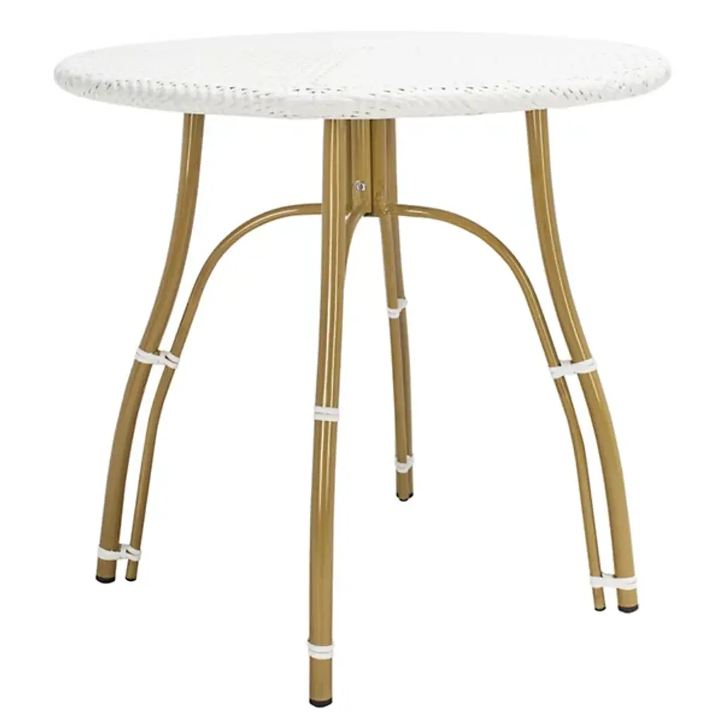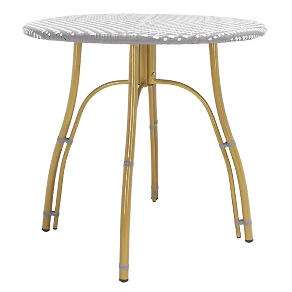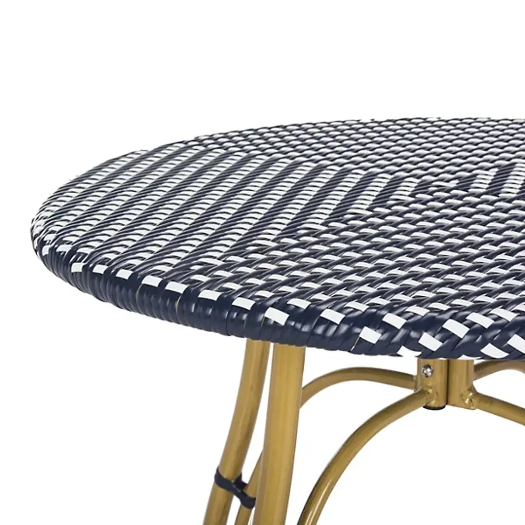 The Dorantes Outdoor Bistro Table from Alder & Ore brings Parisian charm to your outdoor dining experience. Notable for its woven rattan-inspired top over a durable faux bamboo aluminum frame, this table balances classic design elements with modern durability. Its vintage design is perfect for enjoying morning coffee, casual meals, or entertaining guests. Its blend of rustic modern reinforcement and intricate transitional top allow this table to enhance patios, balconies, or garden seating areas with sophistication and character.