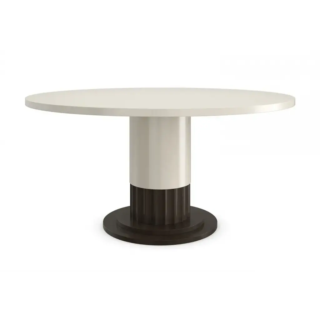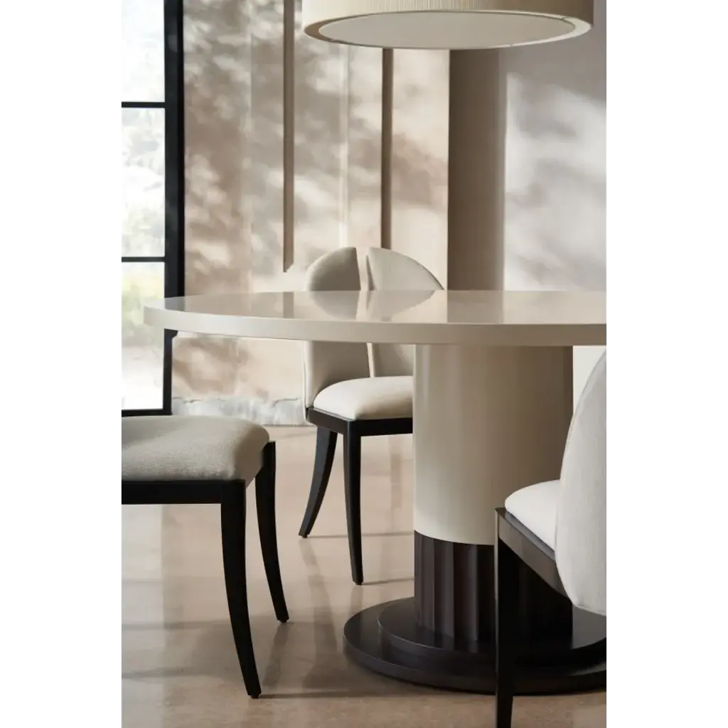 Inspired by ancient Greek architecture and the Doric order of columns, this classic dining table is defined by its prominent, pedestal-style base. Crafted in a mix of poplar and dyed tupelo wood veneers, Dorian features an Ivory-painted column with an overscaled fluting detail in a warm Otter finish. Also finished in Ivory, its simple yet sizable top offers plenty of space for guests to comfortably gather.