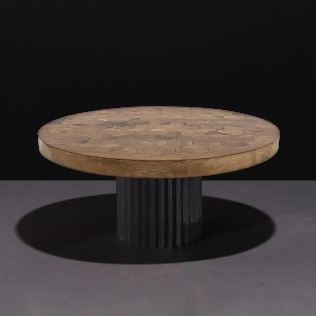 Dining table with ebonized Oak top from old Italian wine barrels and multifaceted pedestal in cast bronze. Inspired by Doric columns in archaic architecture, the extruded multi-point star pedestal has a different finish on each vertical face: the cast metal is polished on one side but left raw on the other. The shading is amplified by the different finishes resulting in a dramatic effect. Crafted in Tuscany, Italy, in a foundry specialized in bronze sculptures, serving artists among the most renowned in the world. Standard top material: ebonized reclaimed Oak. Standard pedestal material: oxidized bronze (polished and coarse). Standard size: round top diameter 160 cm (seats 8), top thickness 10 cm, pedestal diameter 60 cm. Signed by Maker