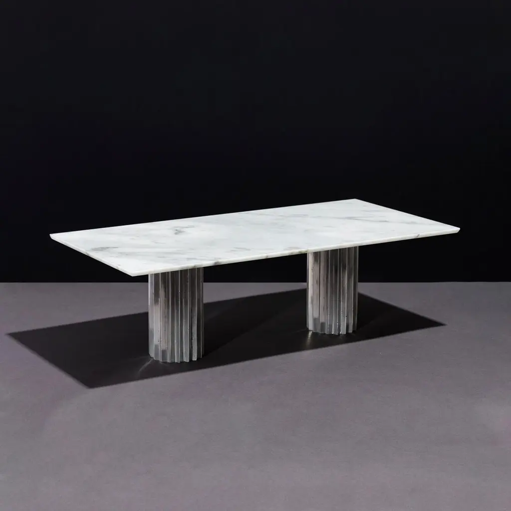 Doris White Carrara Marble Rectangular Dining Table by Fred and JuulDimensions: D 120 x W 240 x H 74 cm.Materials: Aluminum and white Carrara marble.Available in round, oval and rectangular shapes. Also available in different materials. Custom sizes, materials or finishes are available. Please contact us.Dining tables with marble tops and multifaceted pedestals in cast bronze, blackened bronze or aluminum. Inspired by Doric columns in archaic architecture, the extruded multi-point star pedestals have a different finish on each vertical face: the cast metal is polished on one side but left raw on the other. The shading is amplified by the different finishes resulting in a dramatic effect. The pedestal(s) can be combined with tops in any kind of marble and with any shape or dimension. Crafted in Tuscany, Italy, in a foundry specialized in bronze sculptures, serving artists among the most renowned in the world.Fred&Juul, short for Federico Minarelli and Julie Janssen, are two architects who decided working as architects isn’t for them. It was when designing custom furniture for their clients and developing it with the amazingly skilled local artisans that they truly found joy in their work. So, in 2012 they decided to solely focus on that and launched their first lighting and furniture collection. With the exception of the renovation of the old Tuscan farmhouse that would become their home and studio, a labor of sorrow, but mostly love (see the result on the press page!).What sets them apart is how they see and use their materials of choice: bronze, brass, wood and stone. Their designs value the inherent nature of these materials and how they are meticulously crafted, like the grainy, clouded surface of their Raffaele light in sandcast brass or the juxtaposed Oak grains in the marquetry of their Maurits table. Starring all these aspects in the story of a piece, is what makes it unique and last.Over the years they have increasingly worked with interior designers on custom pieces for high end projects all over the world, thanks to their attention for detail, refined aesthetic sense and collaboration with the best highly specialized craftsmen Tuscany has to offer.