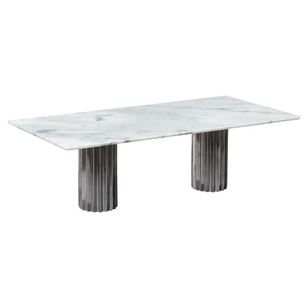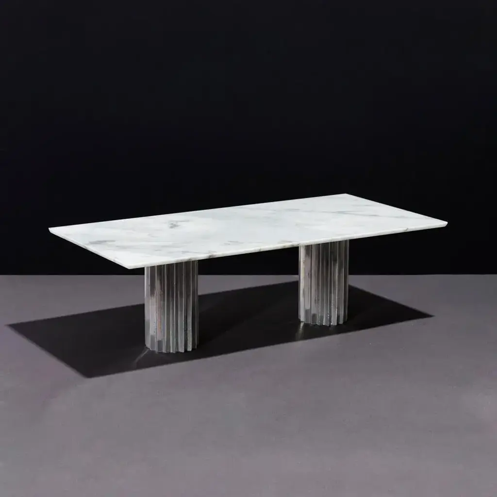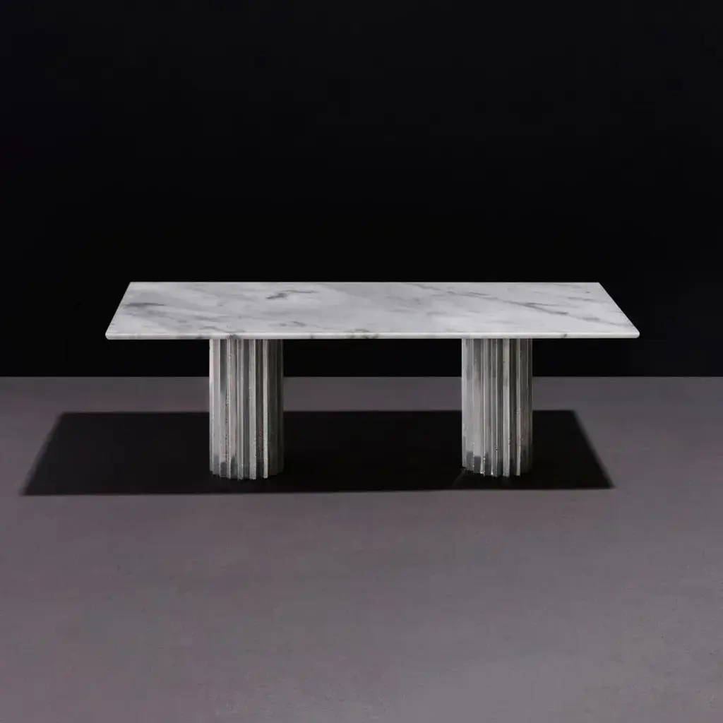 Doris White Carrara Marble Rectangular Dining Table by Fred and Juul Dimensions: D 120 x W 240 x H 74 cm. Materials: Aluminum and white Carrara marble. Available in round, oval and rectangular shapes. Also available in different materials. Custom sizes, materials or finishes are available. Please contact us. Dining tables with marble tops and multifaceted pedestals in cast bronze, blackened bronze or aluminum. Inspired by Doric columns in archaic architecture, the extruded multi-point star pedestals have a different finish on each vertical face: the cast metal is polished on one side but left raw on the other. The shading is amplified by the different finishes resulting in a dramatic effect. The pedestal(s) can be combined with tops in any kind of marble and with any shape or dimension. Crafted in Tuscany, Italy, in a foundry specialized in bronze sculptures, serving artists among the most renowned in the world. Fred&Juul, short for Federico Minarelli and Julie Janssen, are two architects who decided working as architects isn’t for them. It was when designing custom furniture for their clients and developing it with the amazingly skilled local artisans that they truly found joy in their work. So, in 2012 they decided to solely focus on that and launched their first lighting and furniture collection. with the exception of the renovation of the old Tuscan farmhouse that would become their home and studio, a labor of sorrow, but mostly love (see the result on the press page!). What sets them apart is how they see and use their materials of choice: bronze, brass, wood and stone. Their designs value the inherent nature of these materials and how they are meticulously crafted, like the grainy, clouded surface of their Raffaele light in sandcast brass or the juxtaposed Oak grains in the marquetry of their Maurits table. Starring all these aspects in the story of a piece, is what makes it unique and last. Over the years they have increasingly worked with interior designers on custom pieces for high end projects all over the world, thanks to their attention for detail, refined aesthetic sense and collaboration with the best highly specialized craftsmen Tuscany has to offer.
