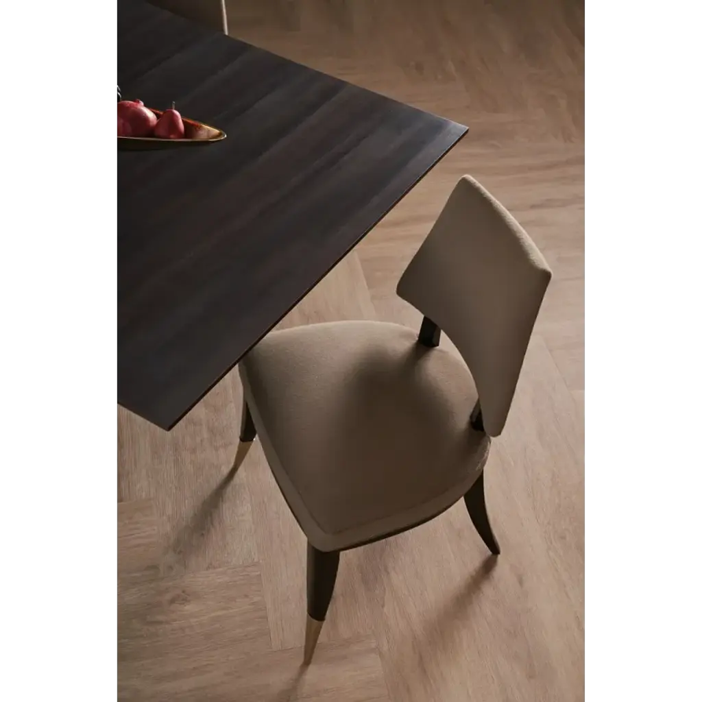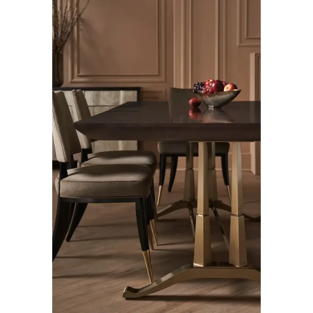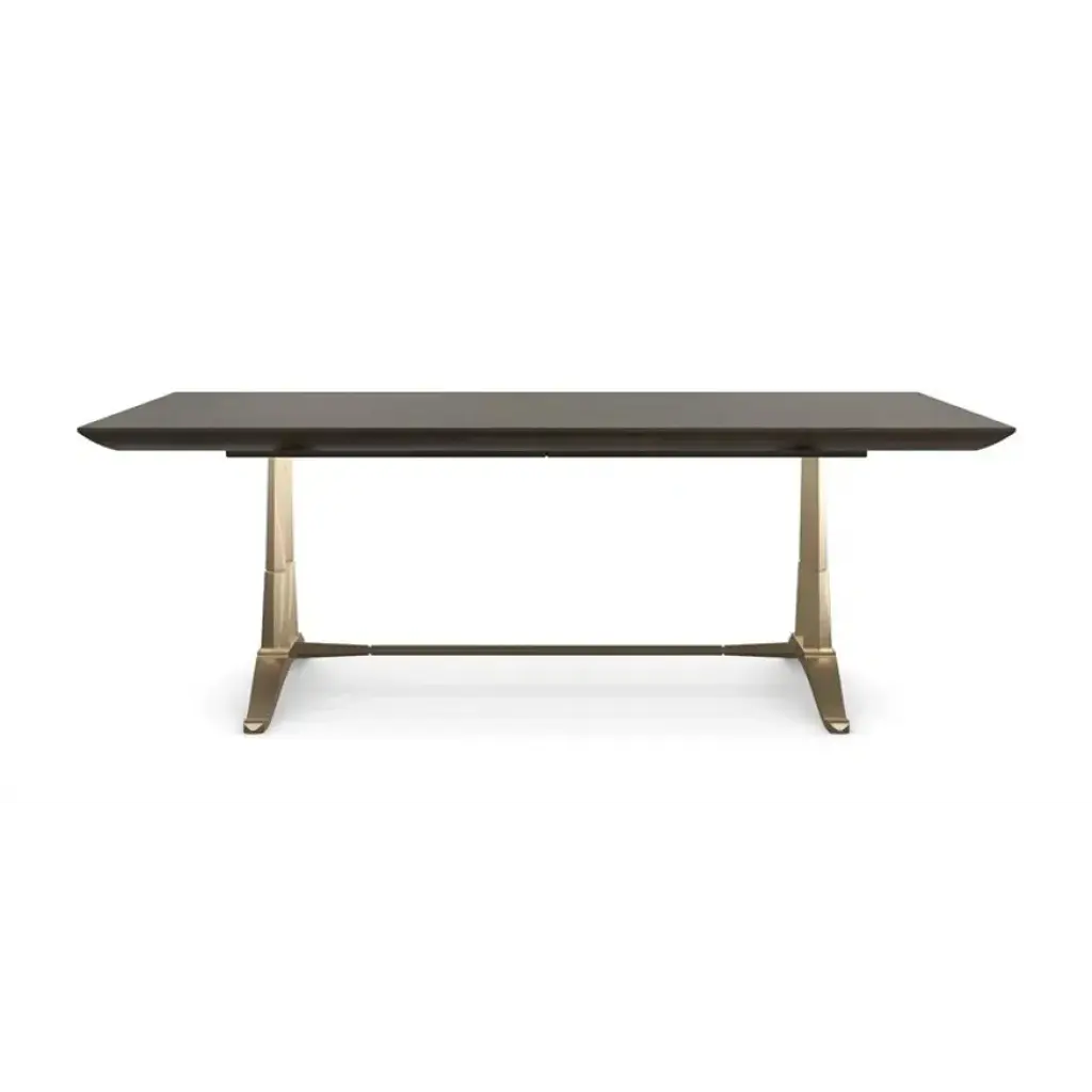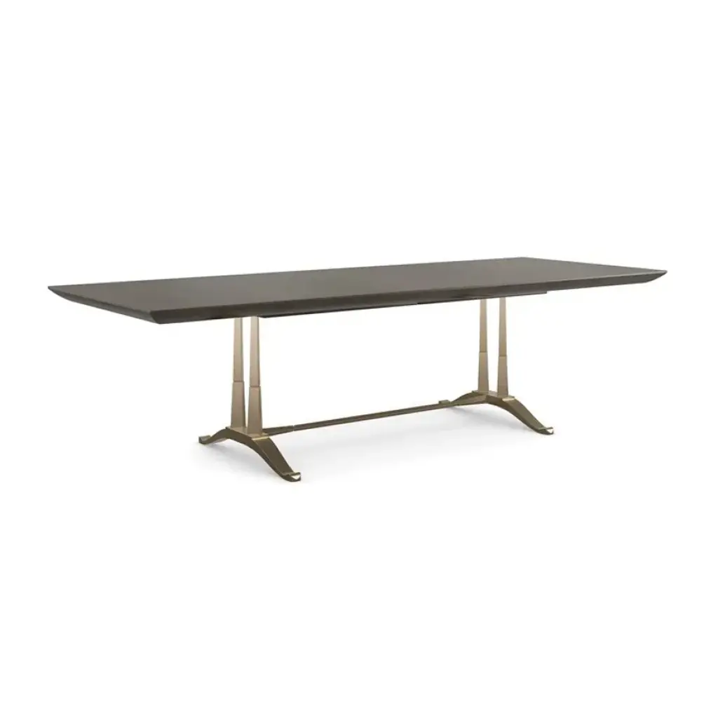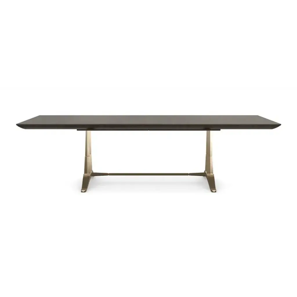 Dually inspired, this modern take on a classic French trestle table recalls the vaulted ceiling of Musee D’orsay, a former Beaux-Arts railway station, and the elegance of a slipper with the same name. Balanced on its Champagne Gold metal frame, an expansive tabletop warms the room with richly grained, tupelo veneers in an Otter finish. Expands to 112” with a single leaf for impromptu parties and surprise dinner guests.