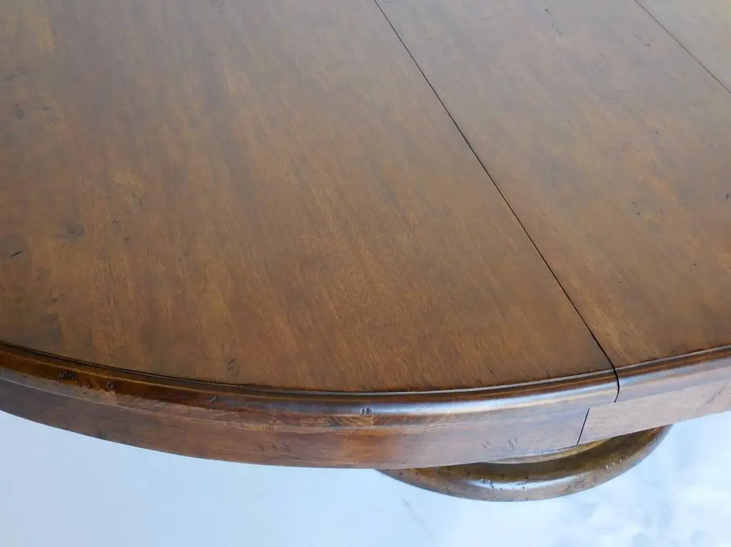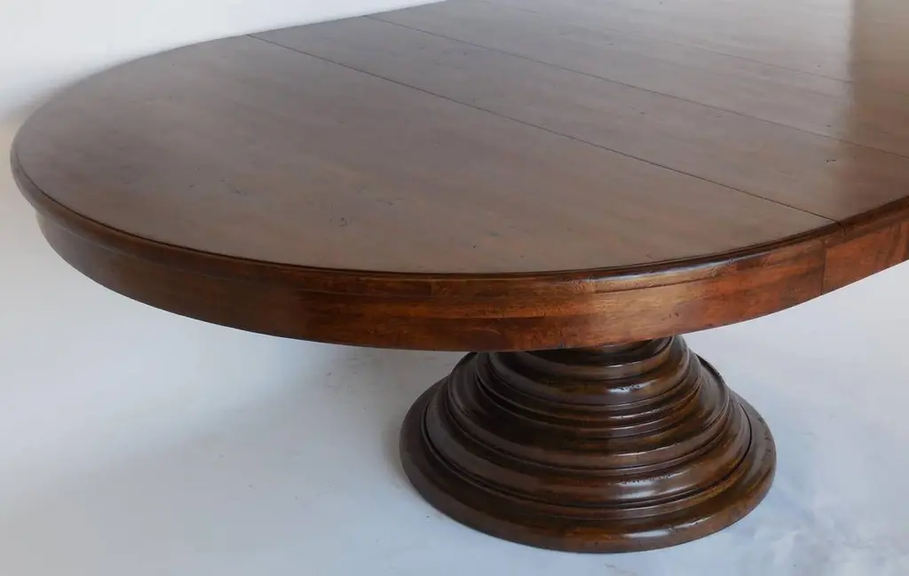 Gorgeous custom pedestal table with two 12 inch leaves. Table measures 60 inches diameter without leaves and 84 inches long with leaves. Can be made in any size and finish. Made in Los Angeles by Dos Gallos Studio.CUSTOM PRICES ARE SUBJECT TO CHANGE. PLEASE INQUIRE BEFORE PLACING AN ORDER. CUSTOM ORDERS ARE NON RETURNABLE. FINAL SALE