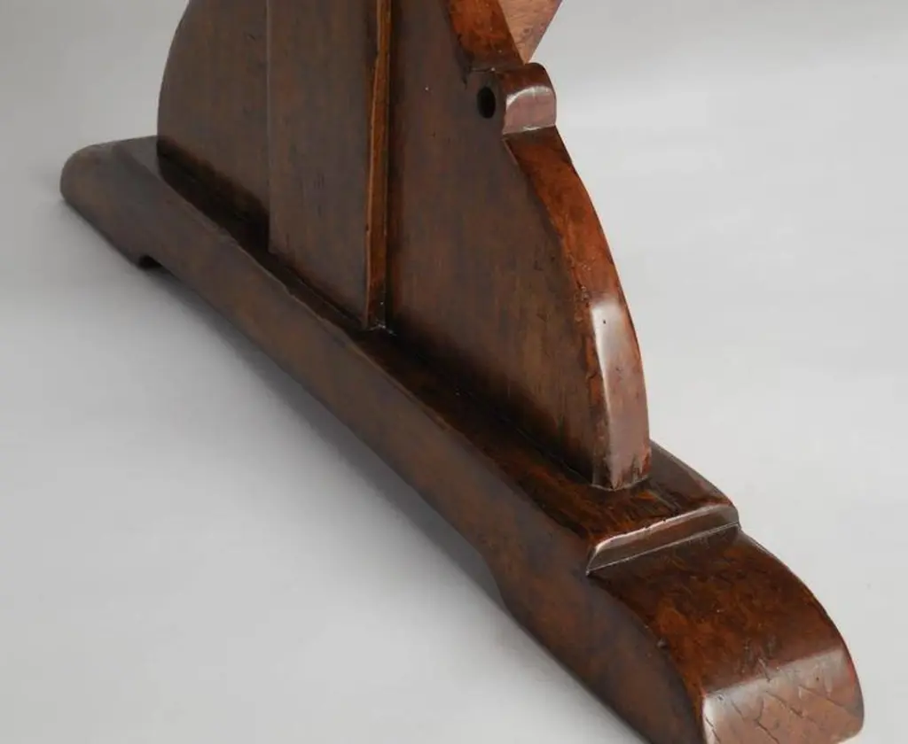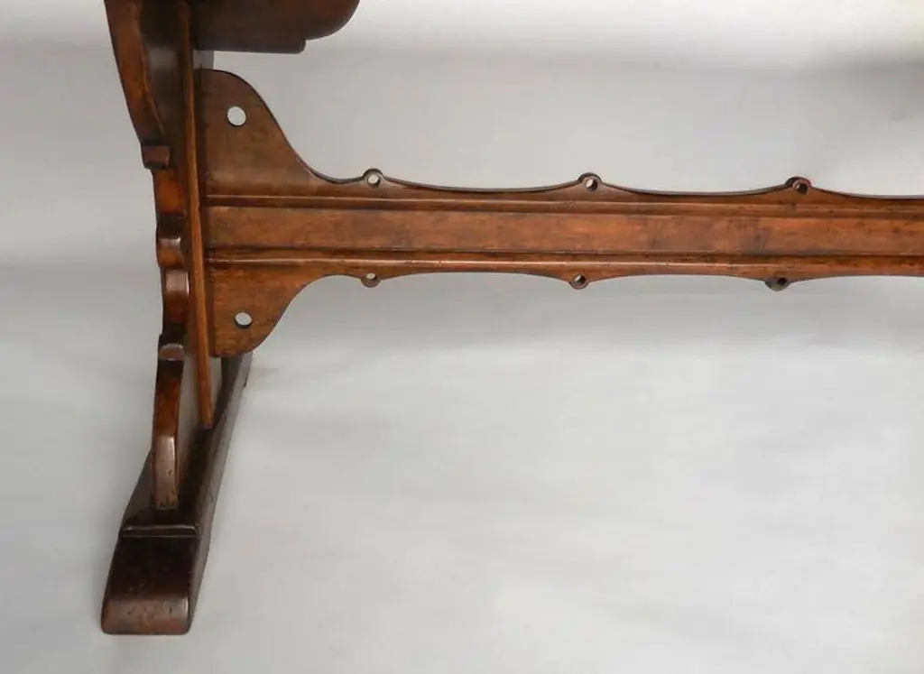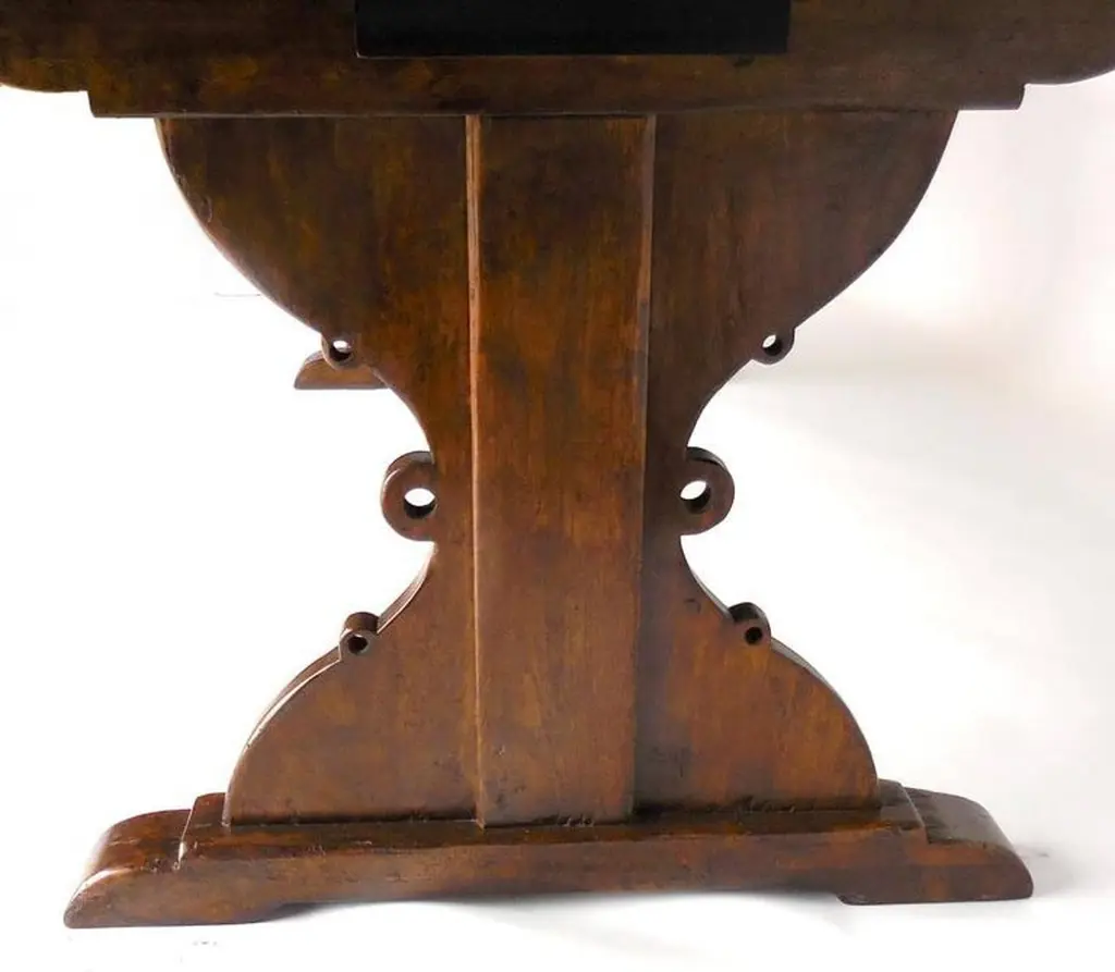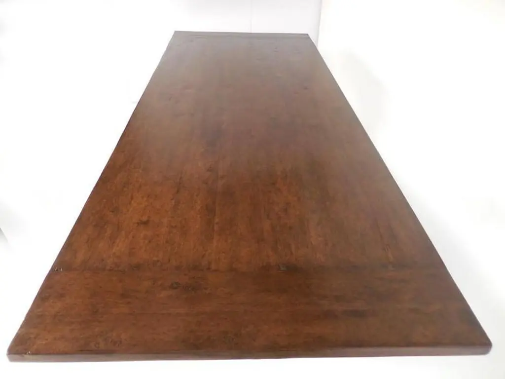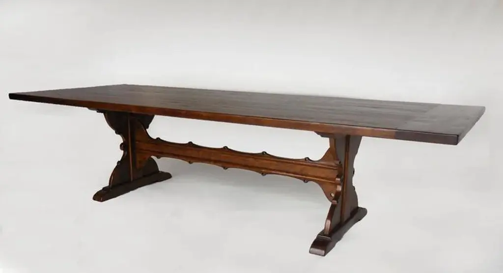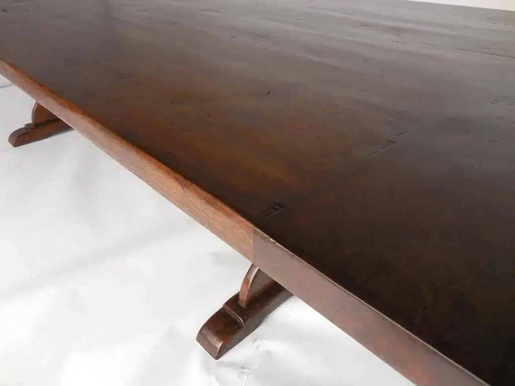 Custom 10' walnut dining table with carved trestle. Based on an antique Spanish monastery table. Large 24 inch overhang on each side created ample space for chairs. Top has breadboards on each end. Great finish. Beautiful table! Can be made in any size and finish. Made in Los Angeles by Dos Gallos Studio. PRICES ARE SUBJECT TO CHANGE. PLEASE INQUIRE BEFORE PLACING AN ORDER. CUSTOM ORDERS ARE NON RETURNABLE. FINAL SALE