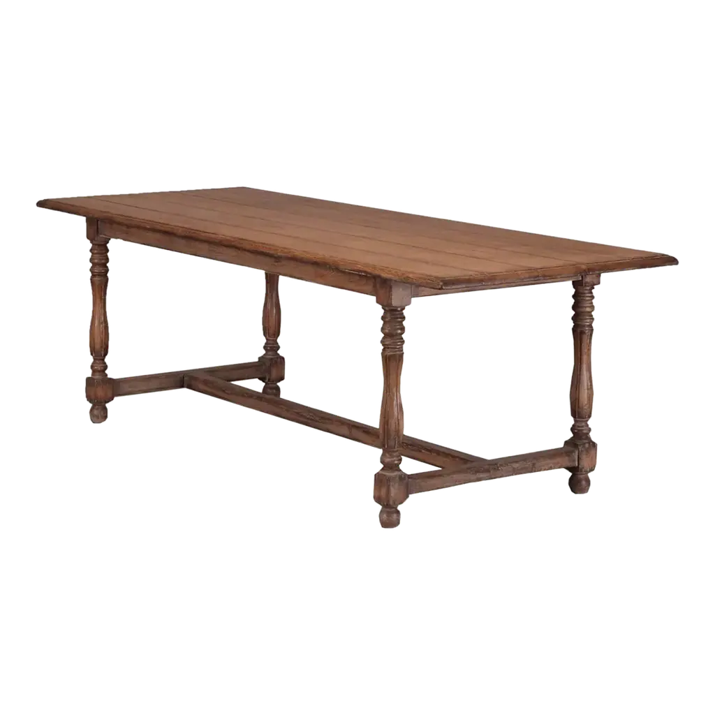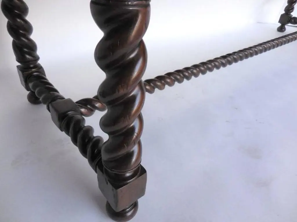 Our handsome custom Barley twist spiral leg table in solid walnut with a custom notched, bevel edged top and breadboards on each end. The long stretcher is also spiraled Can be made in custom sizes and finishes. As shown in walnut with closed grain, dark walnut finish and medium distress. Can also be made in Oak and Mahogany. Made in Los Angeles by Dos Gallos Studio. Custom prices are subject to change. Please inquire.
