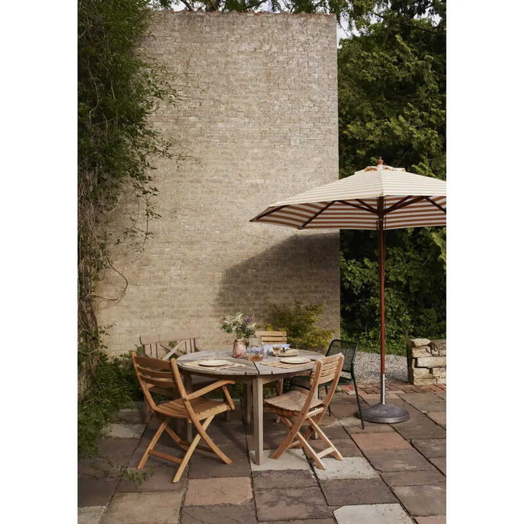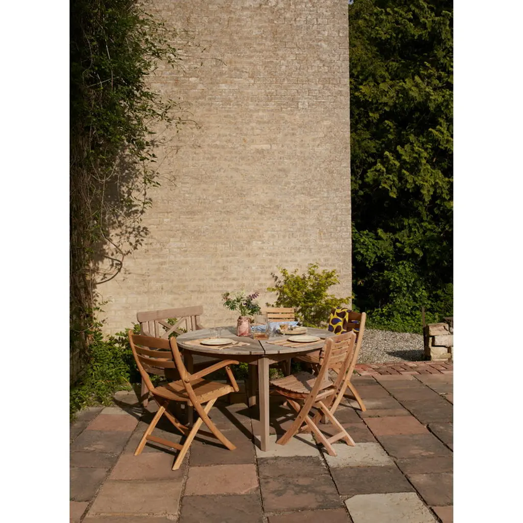Skagerak's Drachmann garden table boasts a charmingly classic design in a material that is known for aging beautifully. The wooden outdoor table is made of high-quality, sustainably produced teak wood, whose hue shifts to a distinguished silver-gray over time. The round table seats four.The Drachmann dining table is part of the eponymous series of outdoor furniture designed by Bernt Santesson. The collection is actually the longest-standing in the Skagerak range – it has been in production since 1982. According to Santesson, his inspiration for the nostalgic, graceful collection stems from the garden of Danish poet and painter, Holger Drachmann.