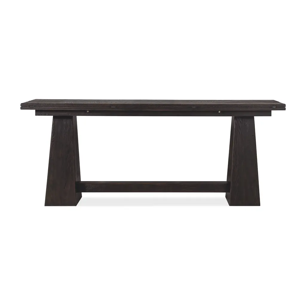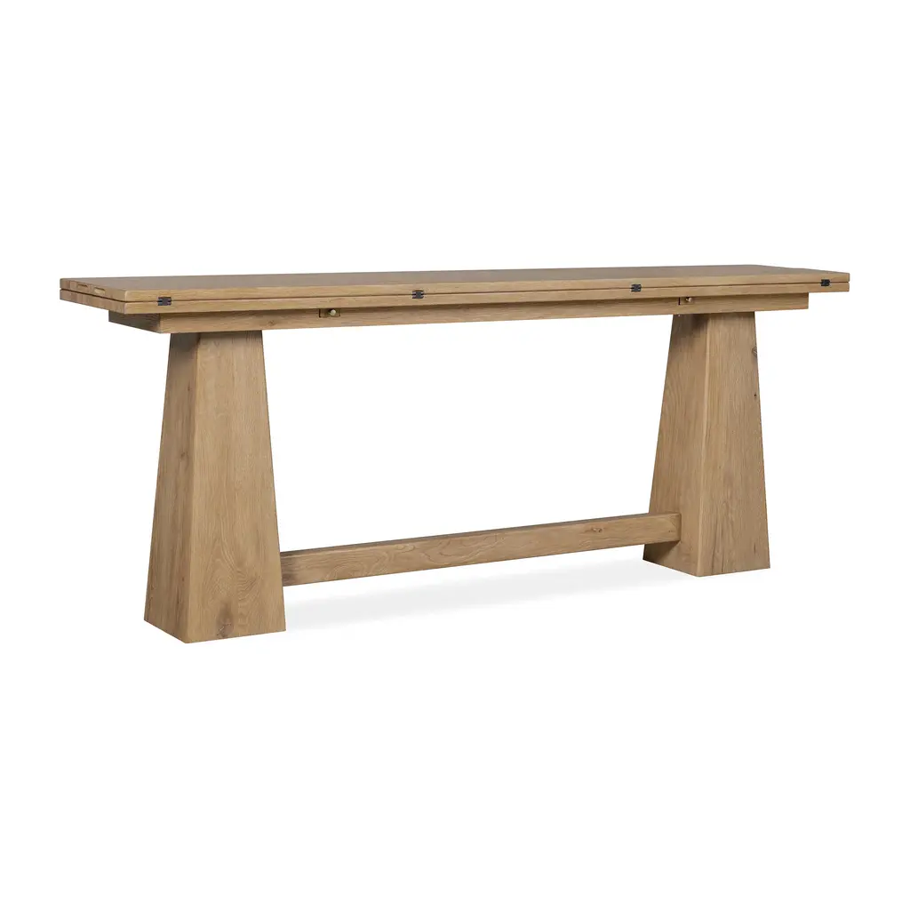 A clever and highly versatile piece for modern living, the Driftwood Flip-Top Console Table from Hooker Furniture is a master of transformation. Timeworn finish, its narrow rectangular shape is perfect for an entryway or behind a sofa. When it's time to entertain, the innovative flip-top doubles the surface area, creating a generous space for serving or intimate dining. Supported by a sturdy double pedestal base, it’s a brilliant fusion of form and multi-purpose function. Highlights: