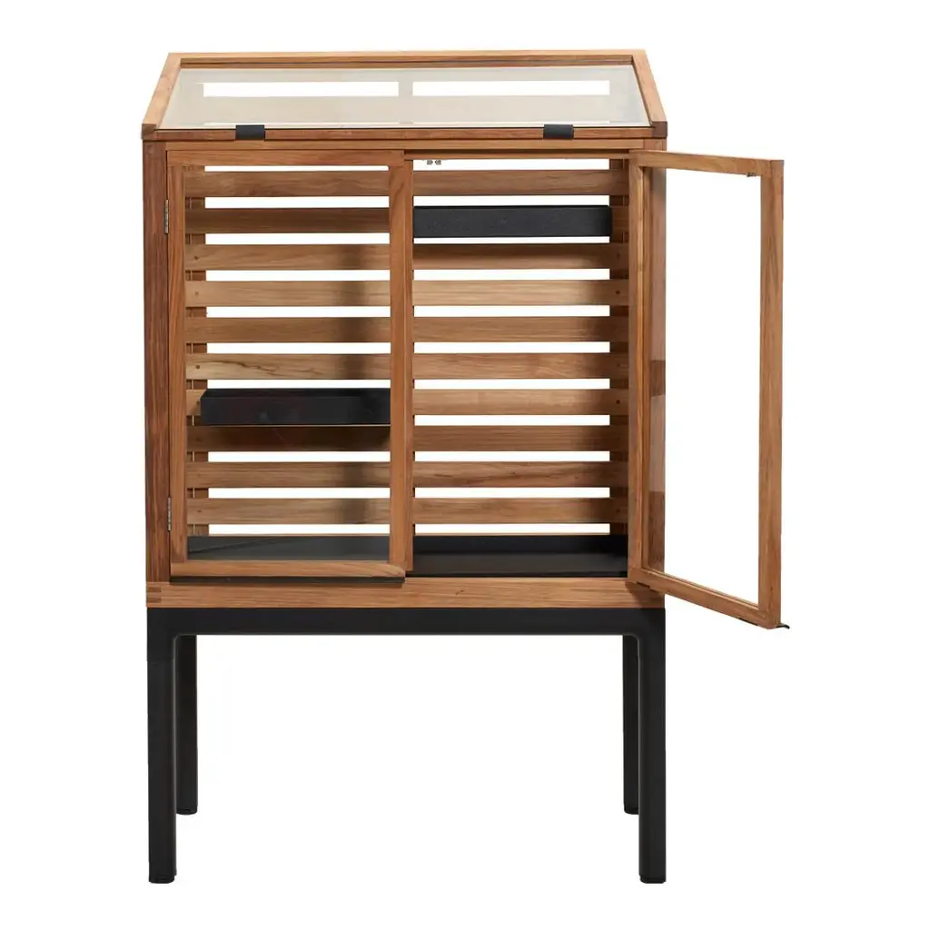 The Drop greenhouse is designed by the Cane-line design team, and is part of the Drop collection, which consists of an outdoor kitchen concept and a selection of outdoor dining tables. The greenhouse is made with a frame in warm teak with glass panes and two doors, so you can easily organize your favorite herbs and vegetables. Cane-line teak is approved and cultivated according to SVLK certification system. With the Drop Greenhouse, you get two practical movable shelves where your greens can be placed. The top of the greenhouse is easily clamped open to create air circulation for your plants, ensuring optimal growth conditions.