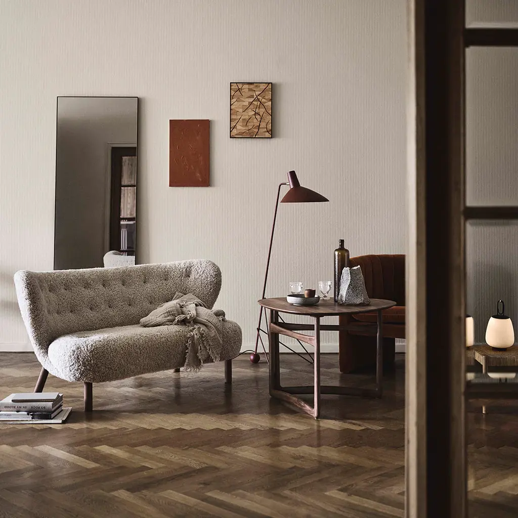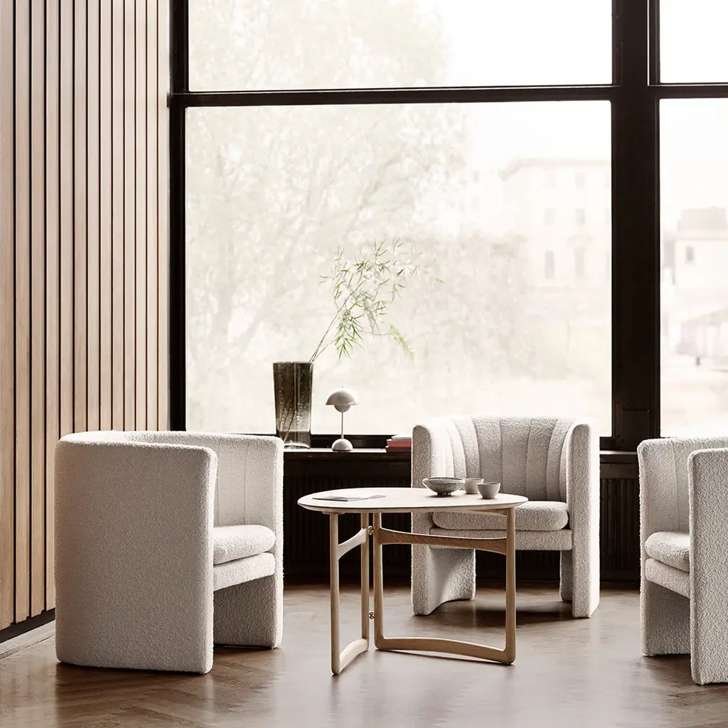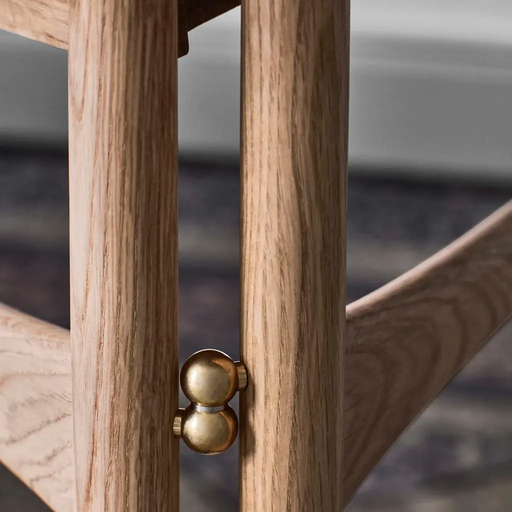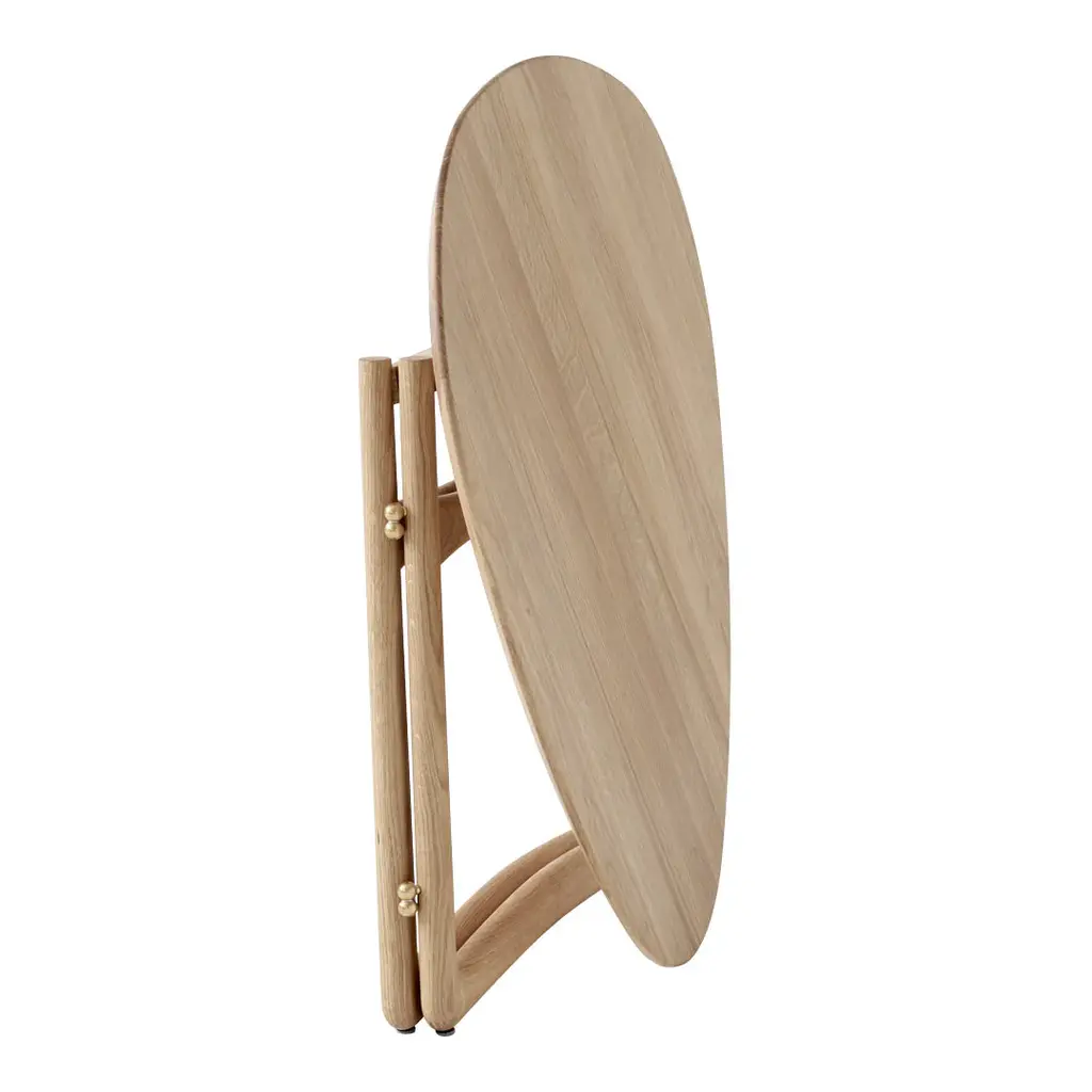 An easily foldable lounge table that provides flexibility. Looking to create a versatile piece that would adapt to its surroundings, duo Hvidt & Molgaard devised Drop Leaf HM5 in 1956. As part of the Drop Leaf series, this lounge table is easily folded in half and tucked away. It also boasts the same curved wooden frames as the larger dining table version. While the drop-leaf style originated in England in the 17th century, this historic design was given a modern Danish rendering by Hvidt & Molgaard in the 50s. The table's foldable design ensures that it's a flexible addition to any home, but such a sharp attention to practicality is balanced with a keen appreciation of form. The table's collapsible wooden frames curve slightly outwards, adding a subtle point of interest. The decision to use frames instead of legs as supports had another benefit: whether folded away or stretched out in a star shape, they create a clean, harmonious form. On the table's underside, brass fittings gleam. Renowned for their rigorous approach to design, Hvidt & Molgaard were pioneers in the shift towards industrialized production. Their understanding of traditional craftsmanship techniques was combined with the determination to craft pieces that were easy to assemble and produce on a mass scale. &Tradition continues their legacy with Drop Leaf, taking great care to remain respectful to the original design.