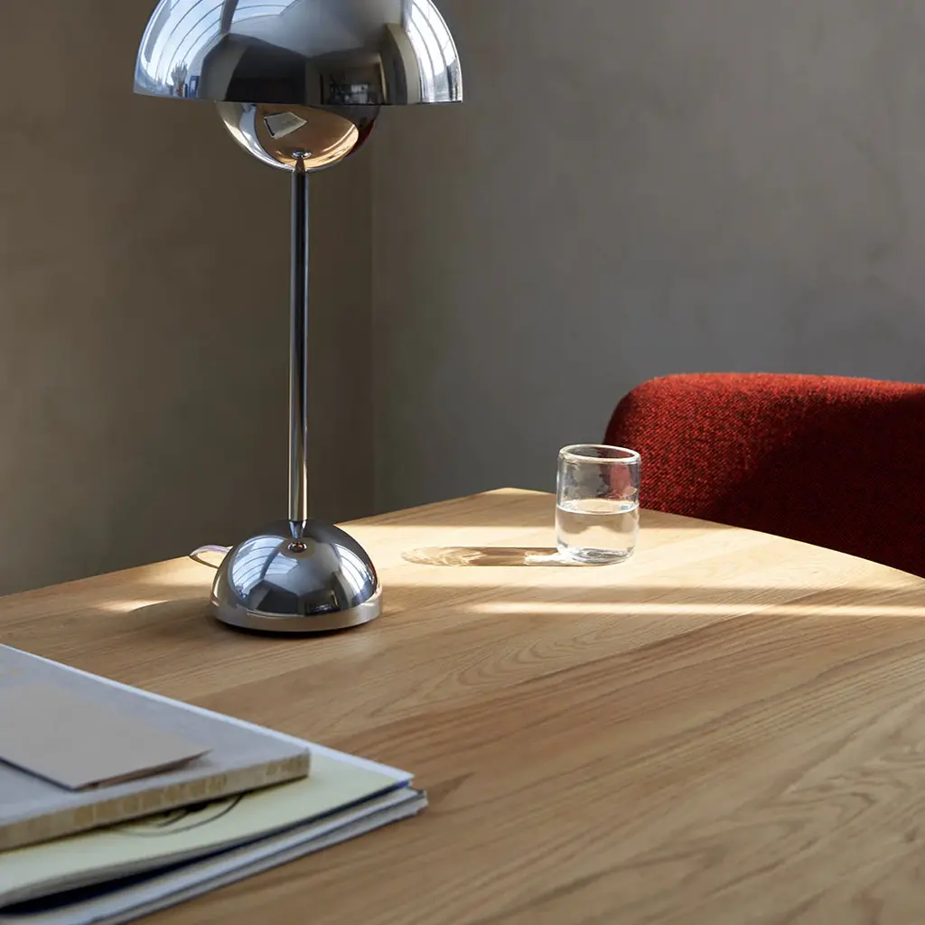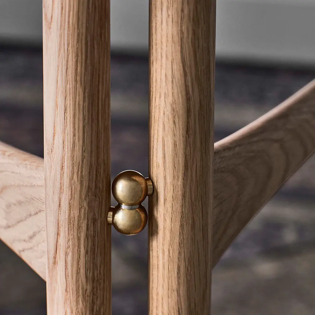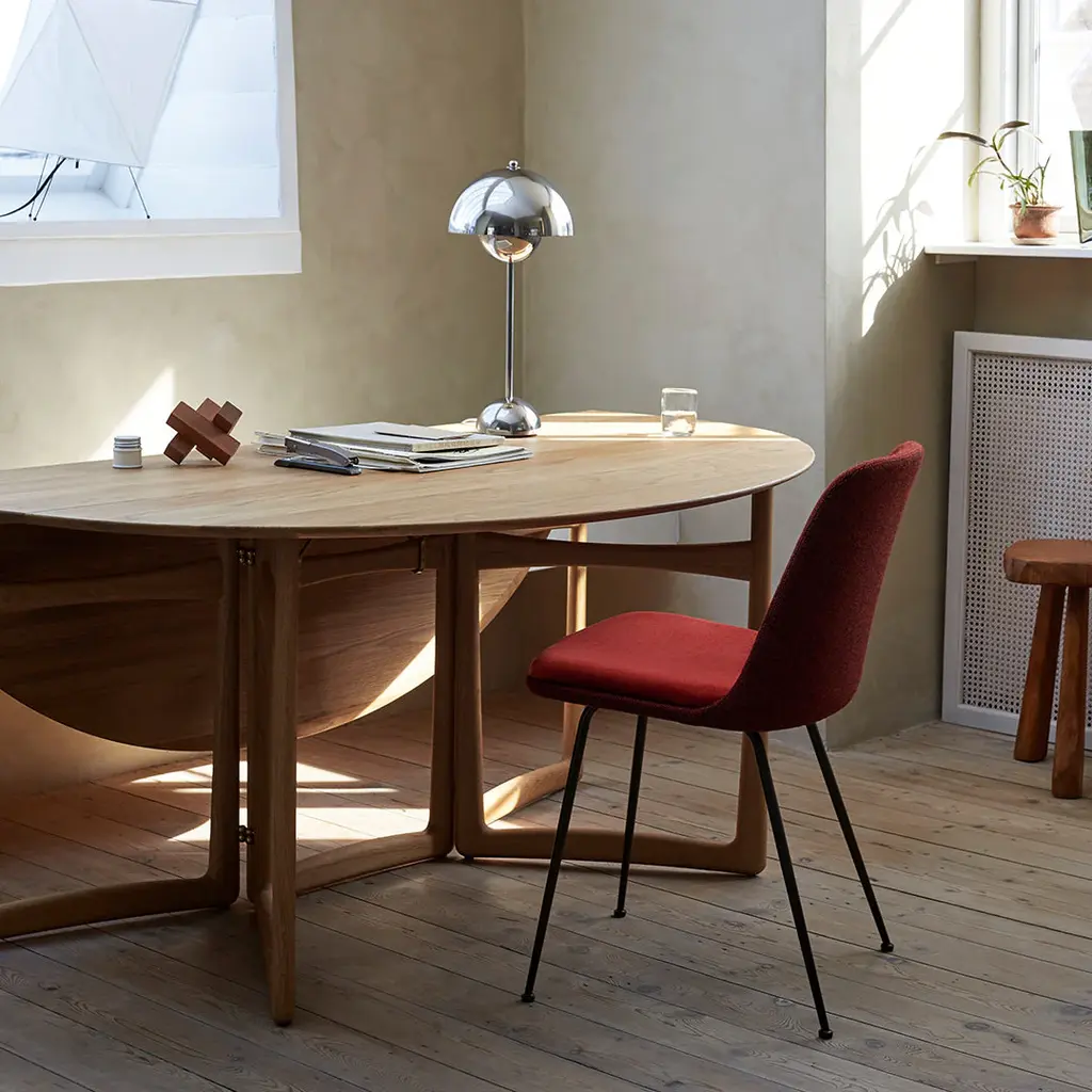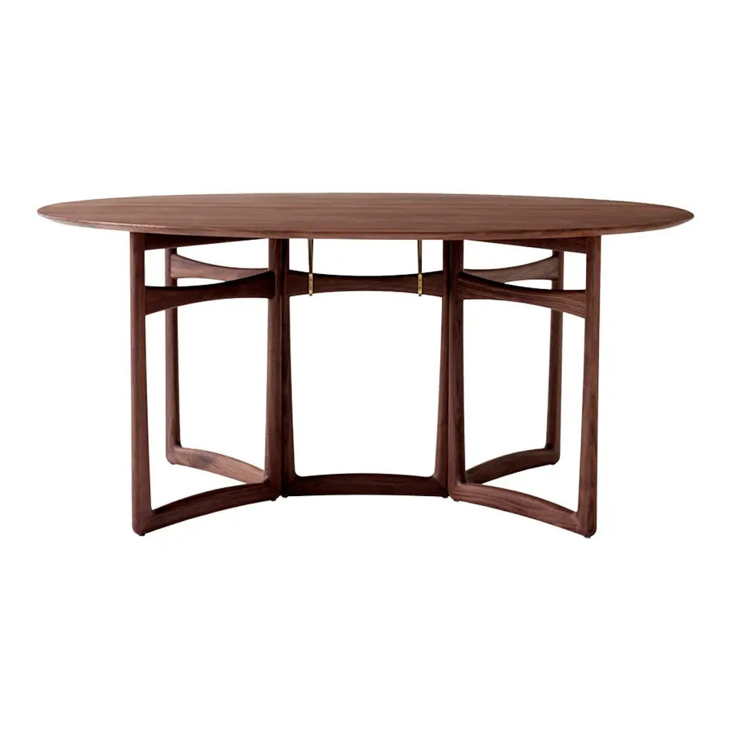 Introducing Drop Leaf, a foldable table that aims to provide flexibility. Looking to create a versatile piece that would adapt to its surroundings, in 1956 design duo Hvidt & Molgaard devised Drop Leaf. As the name suggests, this handsome oak or walnut table is built in the drop-leaf style, with a hinged section on each side that folds down from the fixed center. Such a space-saving design allows it to adapt to a variety of spaces, from a narrow console to its full expression as a dining table. While the drop-leaf style originated in England in the 17th century, this historic design was given a modern Danish rendering by Hvidt & Molgaard in the 50s. Unlike other tables in this style, Drop Leaf can be folded by one person. But this sharp attention to practicality is balanced with a keen appreciation of form. The table's collapsible wooden frames curve slightly outwards, adding a subtle point of interest. The decision to use frames instead of legs as supports had another benefit: whether folded or stretched out in a star shape, they create a clean, harmonious form. On the table's underside, brass fittings gleam. For tighter spaces, the lounge table version is available. This smaller piece boasts the same curved wooden frames and is also foldable. Renowned for their rigorous approach to design, Hvidt & Molgaard were pioneers in the shift towards industrialized production. Their understanding of traditional craftsmanship techniques was combined with the determination to craft pieces that were easy to assemble and produce on a mass scale. &Tradition continues their legacy with Drop Leaf, taking great care to remain respectful to the original design.