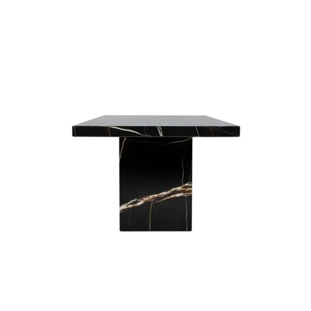 Small dining table DS-788/92 by De Sede. The dining table DS-788 embodies pure delight. Rather than rest on table legs, the stone tabletop in marble, quartz or granite is poised on two panels made of the same natural raw material. The carefully crafted edges and the exclusive material make this unique object a luxurious eye-catcher.Details:Standard configuration: Table with two panels for a table height of 75 cmConstruction: Tabletop and panels in the same finish. Metal frame construction with stone cladding, bolted.Note: The surfaces form irregular patterns; due to technical reasons, visible irregularities cannot be ruled out.