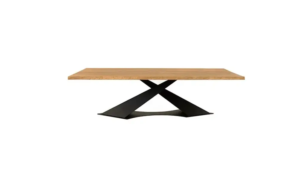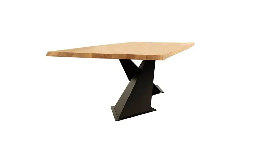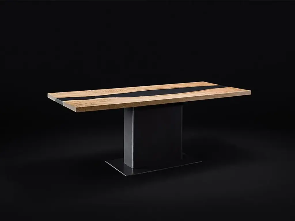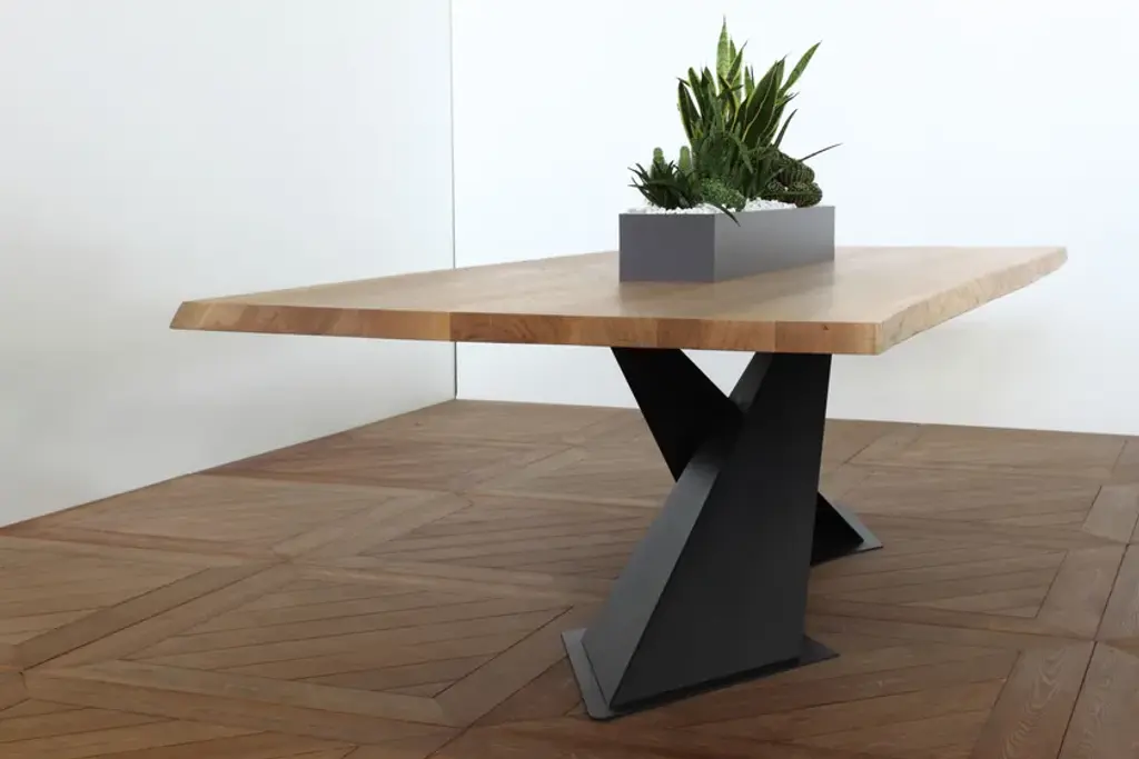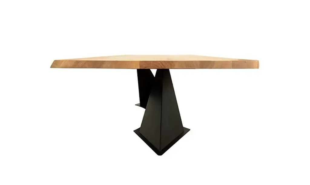 Dubai is an oak and metal table.Welcoming and timeless atmospheres are generated by increasingly sought after geometries and surfaces. In this project the main character is the wood, represented by the 5 cm thick top made in solid oak wood, matched by the metal, available in the following finishes: corten, oil finished sheets or anthracite powder coating. The shape of the base is the distinctive trait of this table: inclined legs with an asymmetrical design that sustain the top.The wood of the top dialogues with the metal of the oil-finished raw sheet. The asymmetrical elements of the central leg cross harmoniously and underline the expressive strength of the wood. The structure is also available in corten and anthracite matt painted finishes.Base finish Anthracite ironRaw black iron with oil finishCorten steelThe Raw collection displays the expressive strength of metal combined with wood, which declares the beauty of its irregularities through uneven veinings, debarked edges and transversal veneers, showing the uniqueness of each trunk section. The collection consists of chairs, stools, shelves, service and coffee tables. Raw collection also includes tables for the dining and living area.