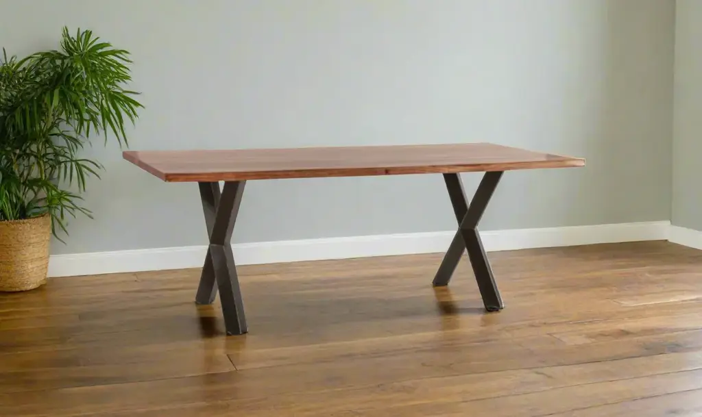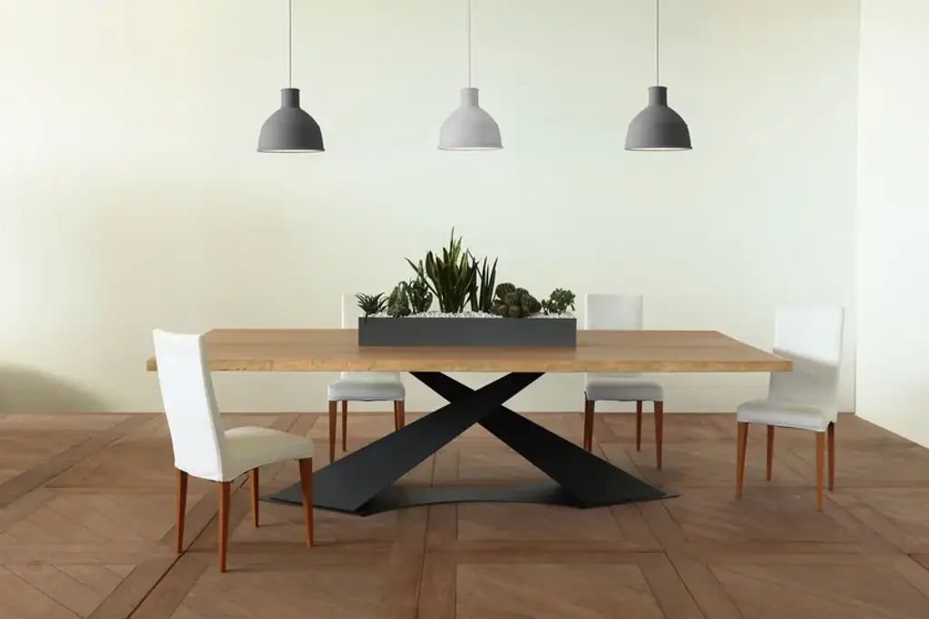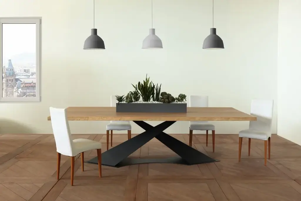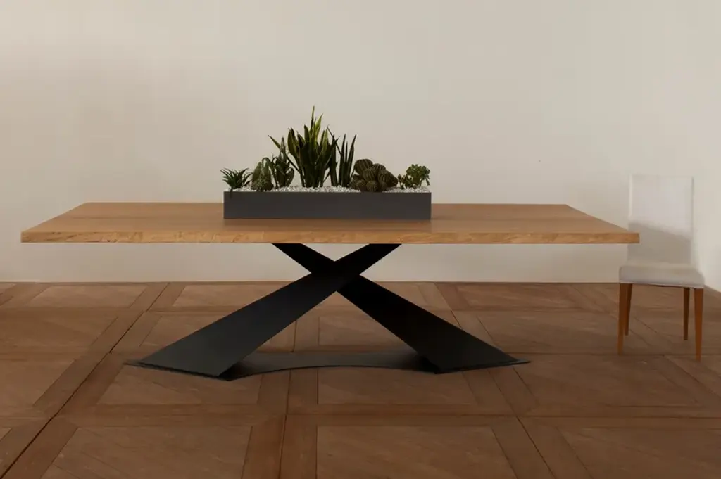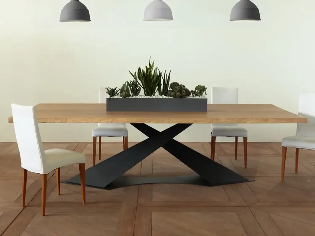 Dubai is an oak and metal table.Welcoming and timeless atmospheres are generated by increasingly sought after geometries and surfaces. In this project the main character is the wood, represented by the 5 cm thick top made in solid oak wood, matched by the metal, available in the following finishes: corten, oil finished sheets or anthracite powder coating. The shape of the base is the distinctive trait of this table: inclined legs with an asymmetrical design that sustain the top.The wood of the top dialogues with the metal of the oil-finished raw sheet. The asymmetrical elements of the central leg cross harmoniously and underline the expressive strength of the wood. The structure is also available in corten and anthracite matt painted finishes.Base finish Anthracite ironRaw black iron with oil finishCorten steelThe Raw collection displays the expressive strength of metal combined with wood, which declares the beauty of its irregularities through uneven veinings, debarked edges and transversal veneers, showing the uniqueness of each trunk section. The collection consists of chairs, stools, shelves, service and coffee tables. Raw collection also includes tables for the dining and living area.