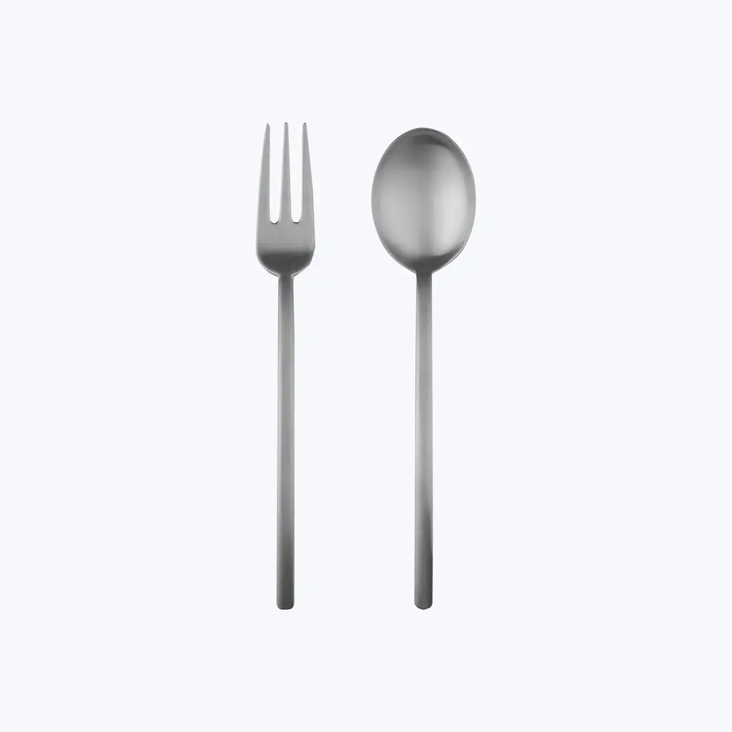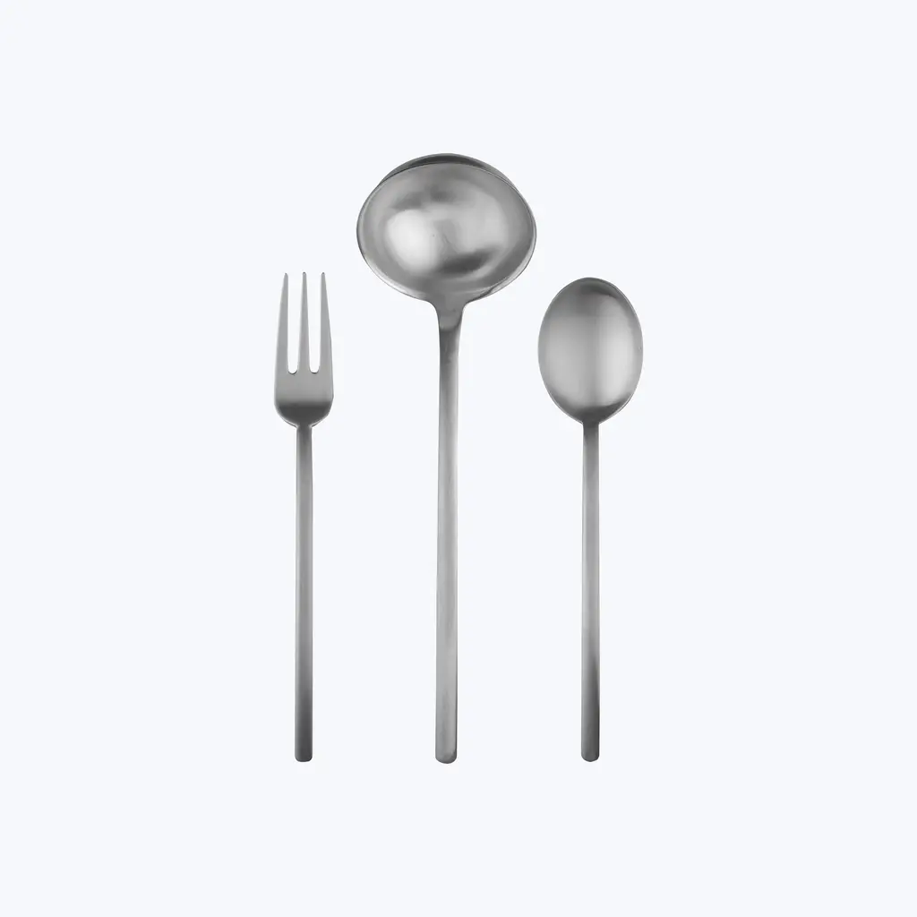 Due Serveware is made of the highest quality 18/10 steel, 4 mm thick, very durable, and incredibly ergonomic for dinner parties and everyday use. Enhance your dining experience with this beautiful Italian flatware! Dishwasher and food safe. Created in 1947, Mepra is a family-owned and operated company with a worldwide presence in flatware, cookware, and stainless-steel products. Today, Mepra flatware and kitchenware appear on the tables of the most prestigious hotels, award-winning restaurants, and artisanal-centered homes. Bring the magic of three generations worth of Italian traditions, designs, and lifestyles into your kitchen and dining room today. Stainless Steel plating features a special vintage process that gives it a rustic, warm, and elegant appearance while still being durable and inoxidizable coating. Winners of the 2020 Good Design Award, the Bronzo, Oro Nero, Oro, and Ice Oro Collections are perfect for the most refined and stylish homes with their pure lines and harmoniously light forms. Champagne Ice, Ice Bronze, Ice, and Ice Oro Nero are coated with a PVD Titanium Coating that is tested and guaranteed for more than 3000 washes in a commercial dishwasher. The special Titanium Plating was originally developed by NASA, resulting in a durable and inoxidizable coating like non-other. 7 Piece Full Serving Set includes (1) Serving Fork, (1) Serving Spoon, (1) Salad Serving Fork, (1) Salad Serving Spoon, (1) Soup Ladle, (1) Gravy Ladle, and (1) Cake Server