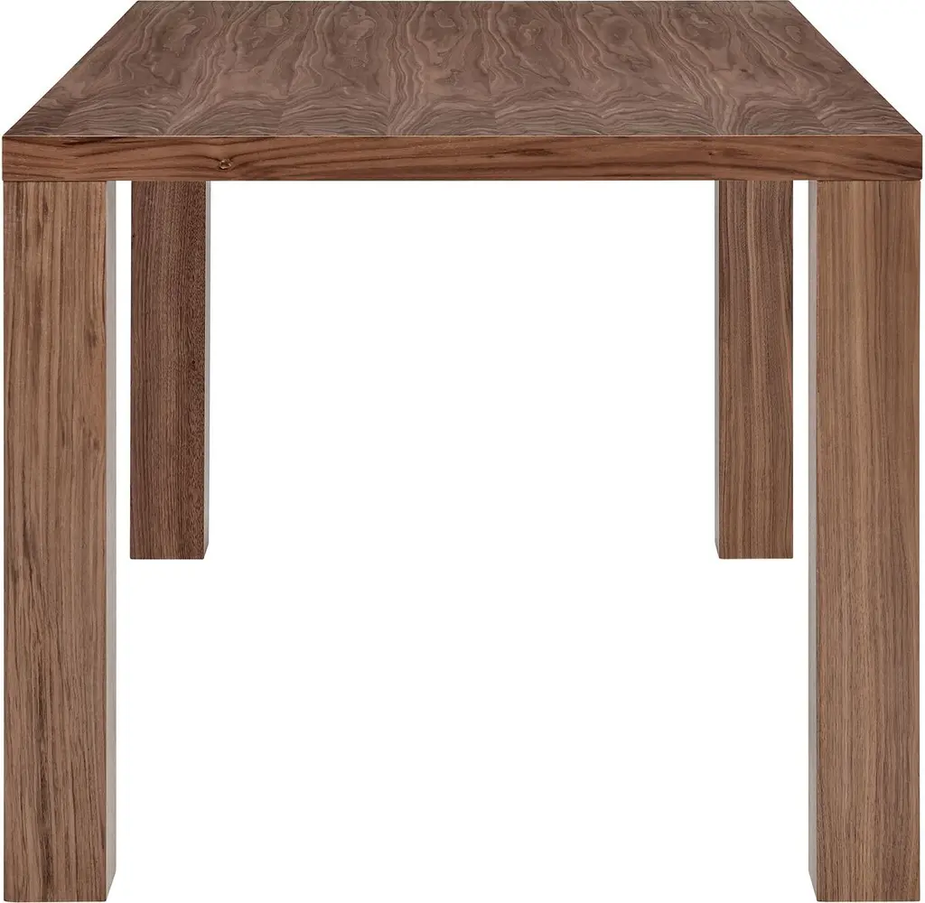 A style chameleon, this dining table can easily be dressed up or down, thanks to its clean lines and walnut finish. Metal rods in the legs ensure maximum durability. Seats up to six people.