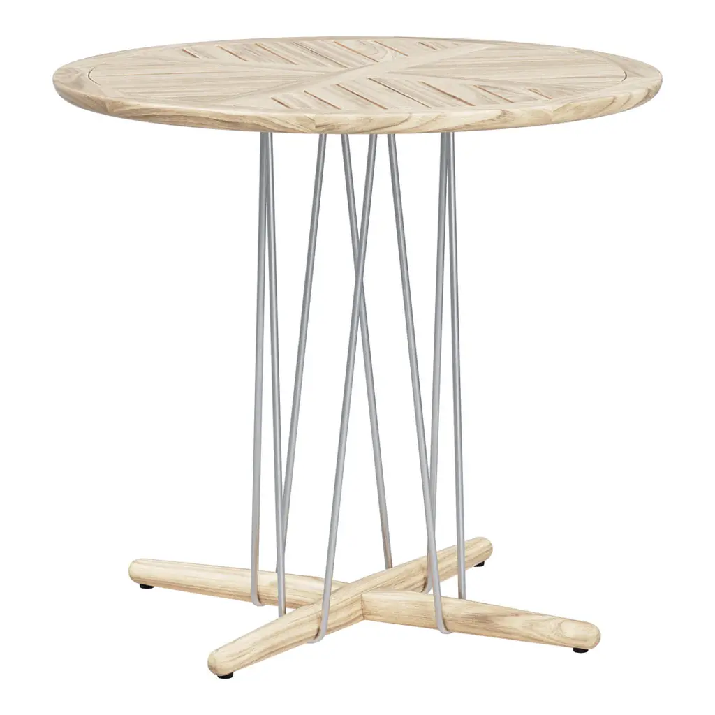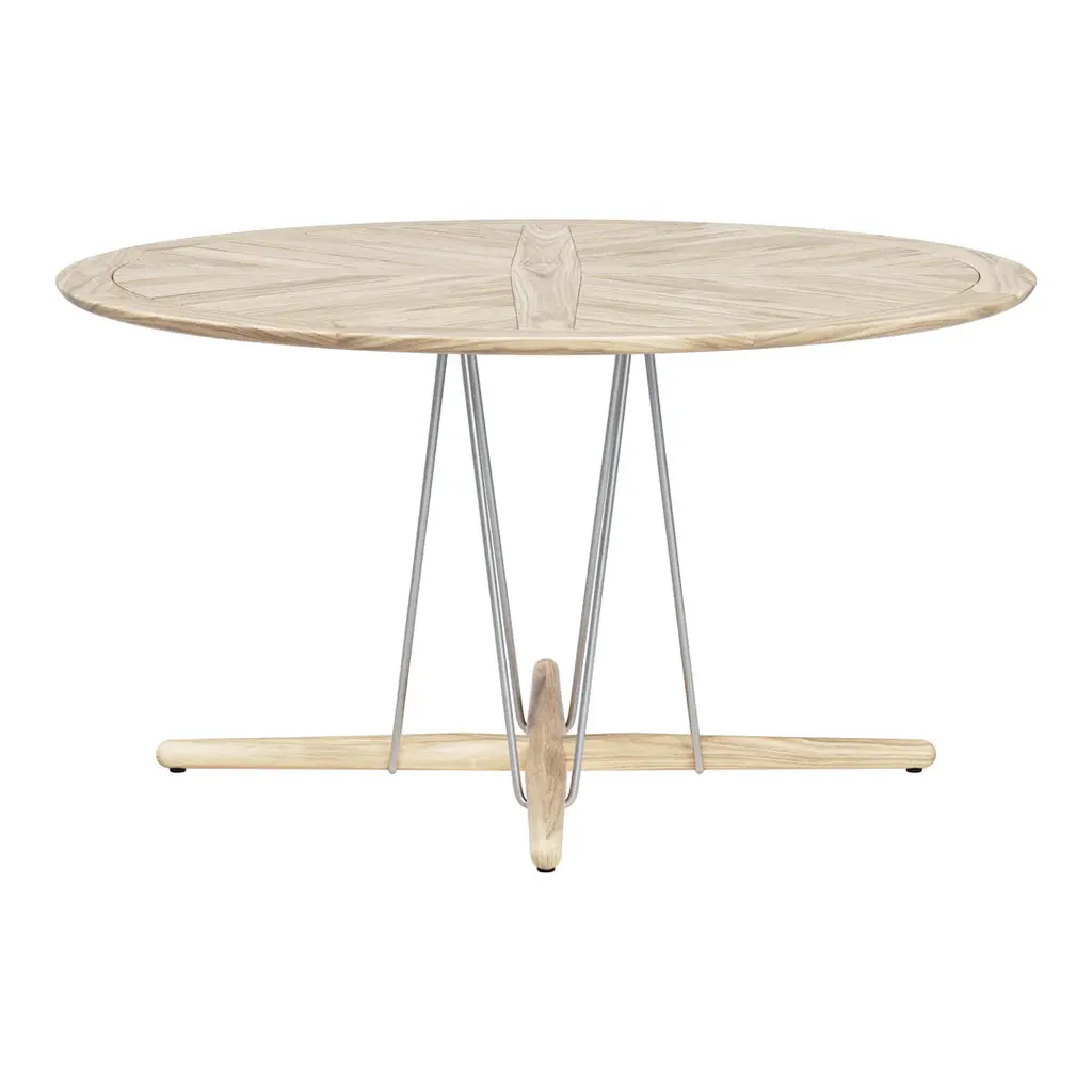 EOOS has represented the contemporary side of Carl Hansen & Søn's collection since 2015. Inspired by the existing Embrace Series of tables, chairs and sofas, the design trio presents the Embrace Outdoor Series, seamlessly extending the unparalleled experience of comfort and relaxation to outdoor spaces. The E022 Embrace Outdoor Dining Table is available in three sizes to adapt to a variety of spaces, meticulously crafted in FSC-certified untreated teak to allow for its unique patina to develop in its environment. As a result of EOOS's poetic approach towards the design process, the table has a light expression, as if almost floating. Inspired by a kite's tether, a playful motif that carries across the Embrace Series, the table is comprised of three parts with an anchoring wood base, steel wire structure and a daisy formation tabletop comprised of up to 50 individual pieces. This circular outdoor table offers ample legroom, encouraging relaxed conversation, and fits with the upholstered EOO8 E mbrace Outdoor Dining Chair from the same series.