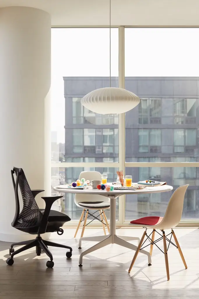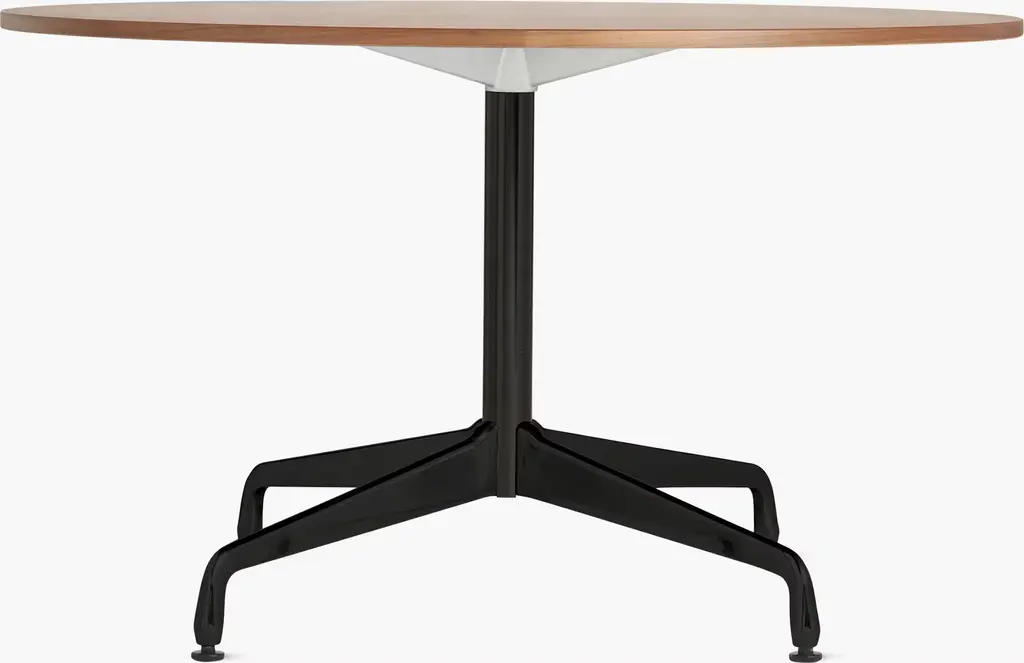 The versatile Eames Table (1964) is a durable, simple, sleek solution for residential and commercial settings. It features a sturdy streamlined base with plenty of legroom and leveling floor glides for uneven surfaces. Depending on selected options, the table is constructed of varying percentages of recycled and recyclable materials. This is an authentic Eames Table by Herman Miller. Greenguard Certified. Simple assembly required.