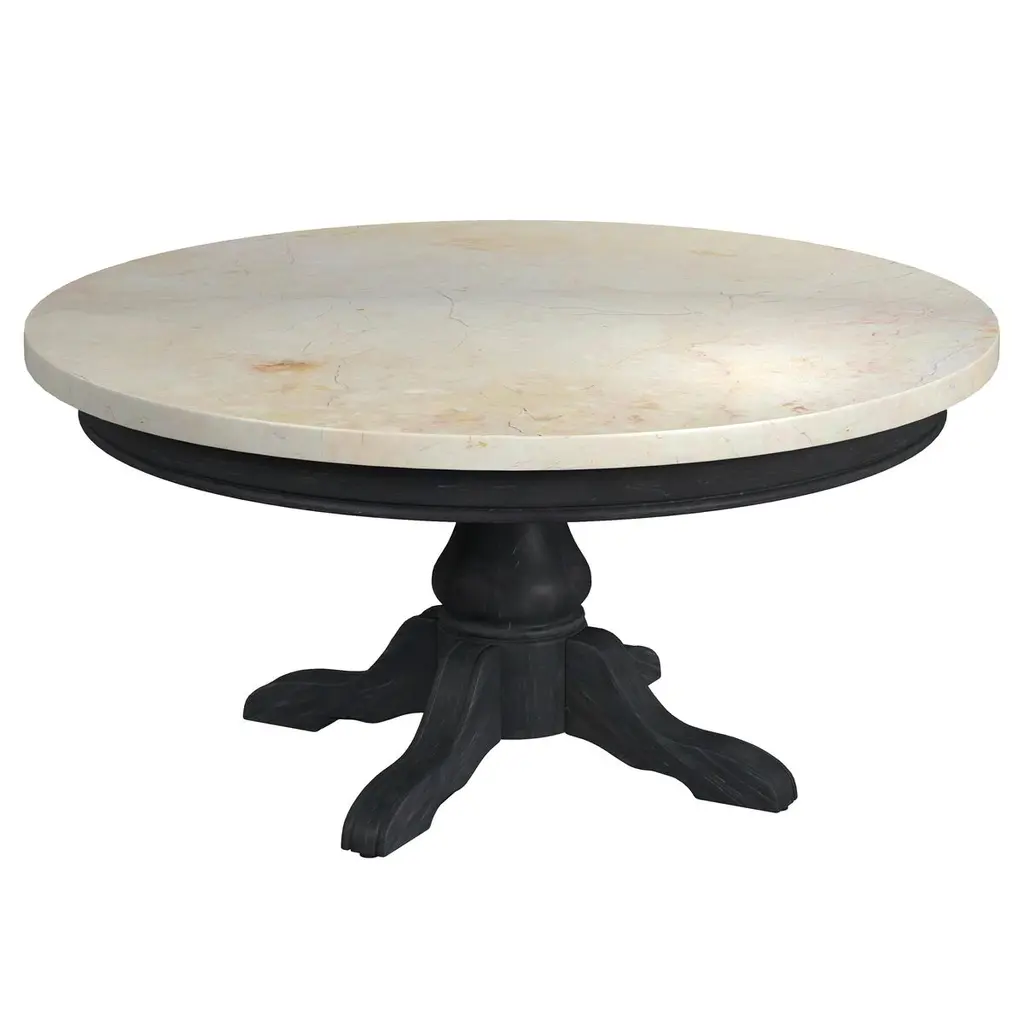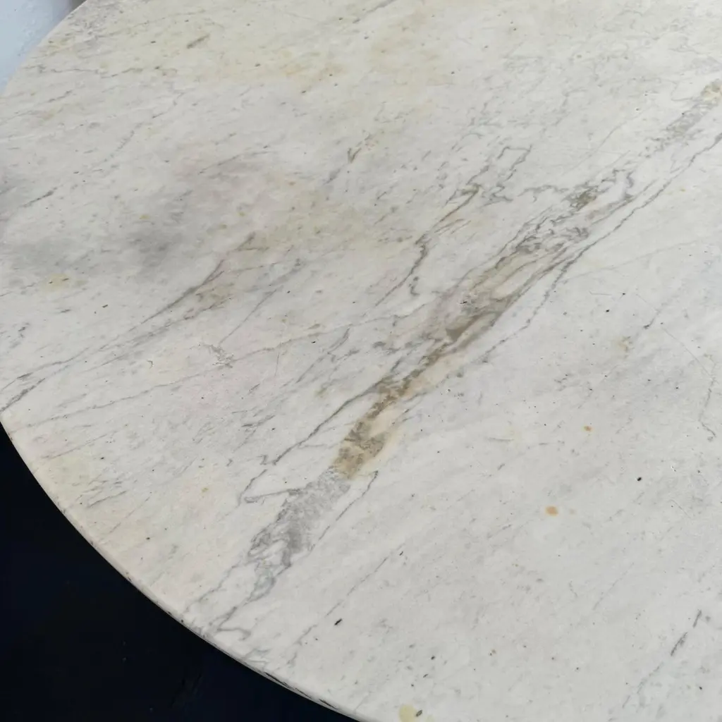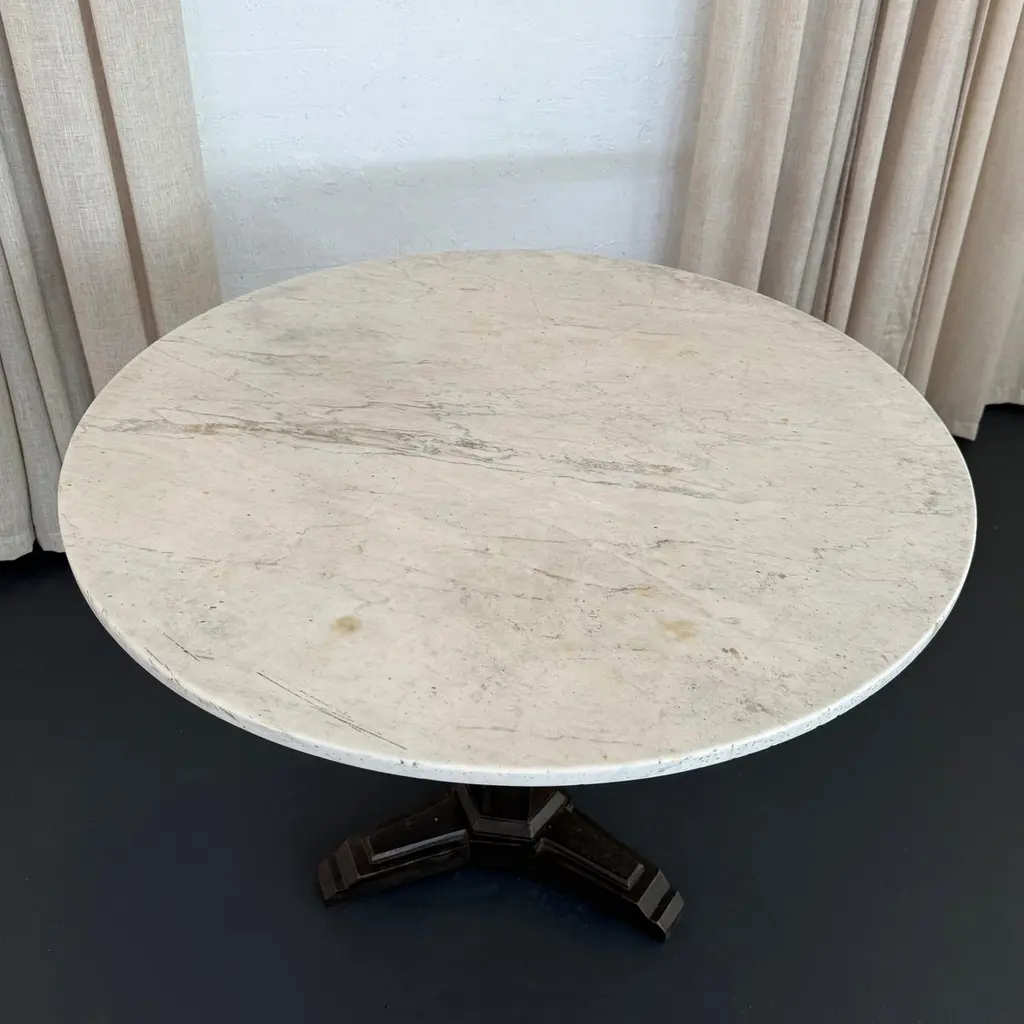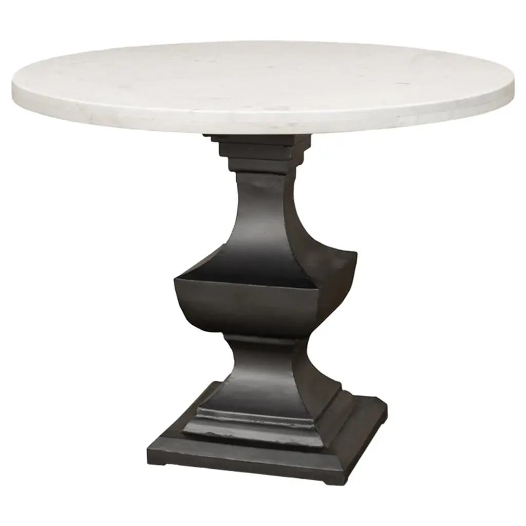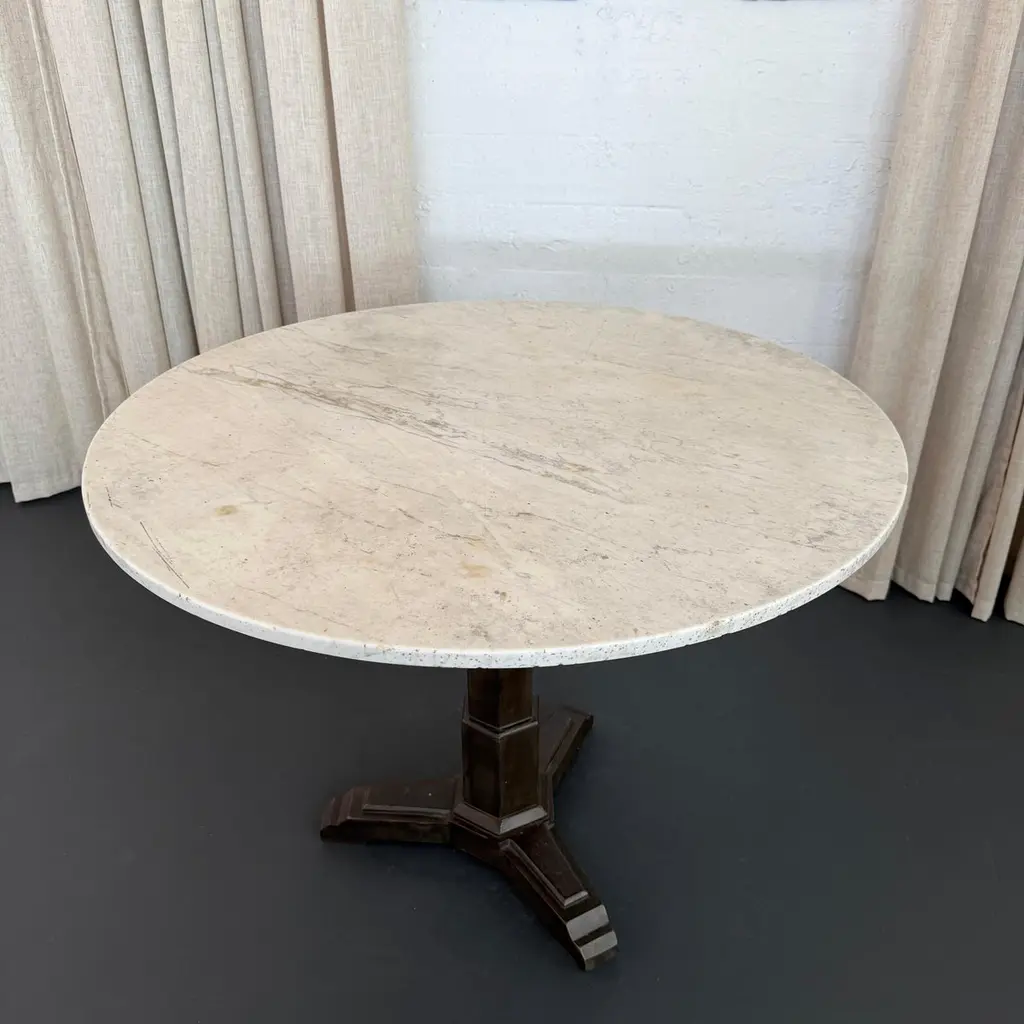 This round, Art Deco, café, bistro, or dining table circa 1930s features a vintage 40" diameter, 1" thick, white and gray grained marble top. The top shows it's original patina - some spots on the marble as shown that attest to its age. The weighted cast iron American Art Deco, "skyscraper" style, railroad dining car, pedestal base is supported by three feet with distinctive geometric profile. The diameter of the base measures 19.5 inches. It's a classic and elegant piece of furniture with historical charm.