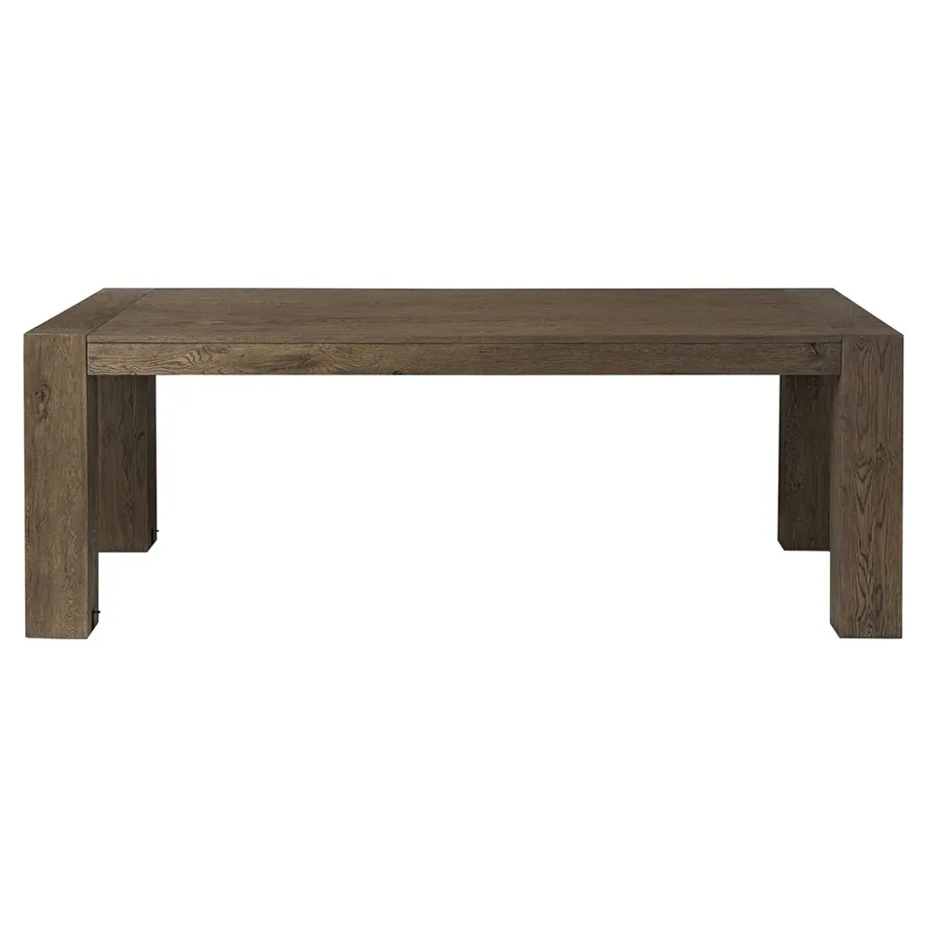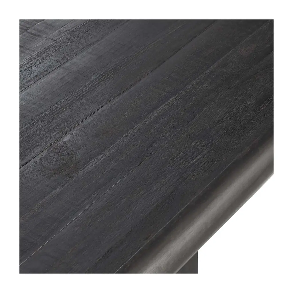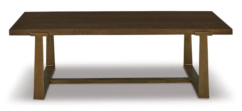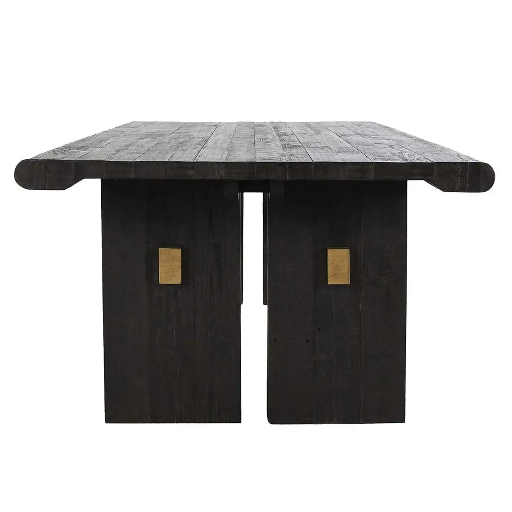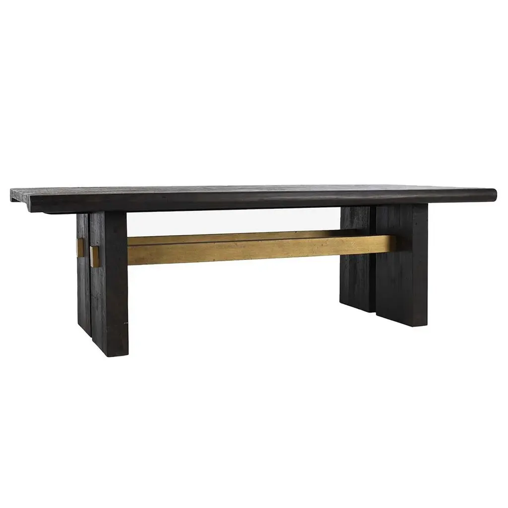 Ebony finish modern and unique luxe solid wood dining table with brass finish iron trestle posts. Wonderful contrast of rustic and contemporary elegance. Natural wood grain, imperfections, and finish will vary inherently with each table. Weighs approx. 265 lbs.