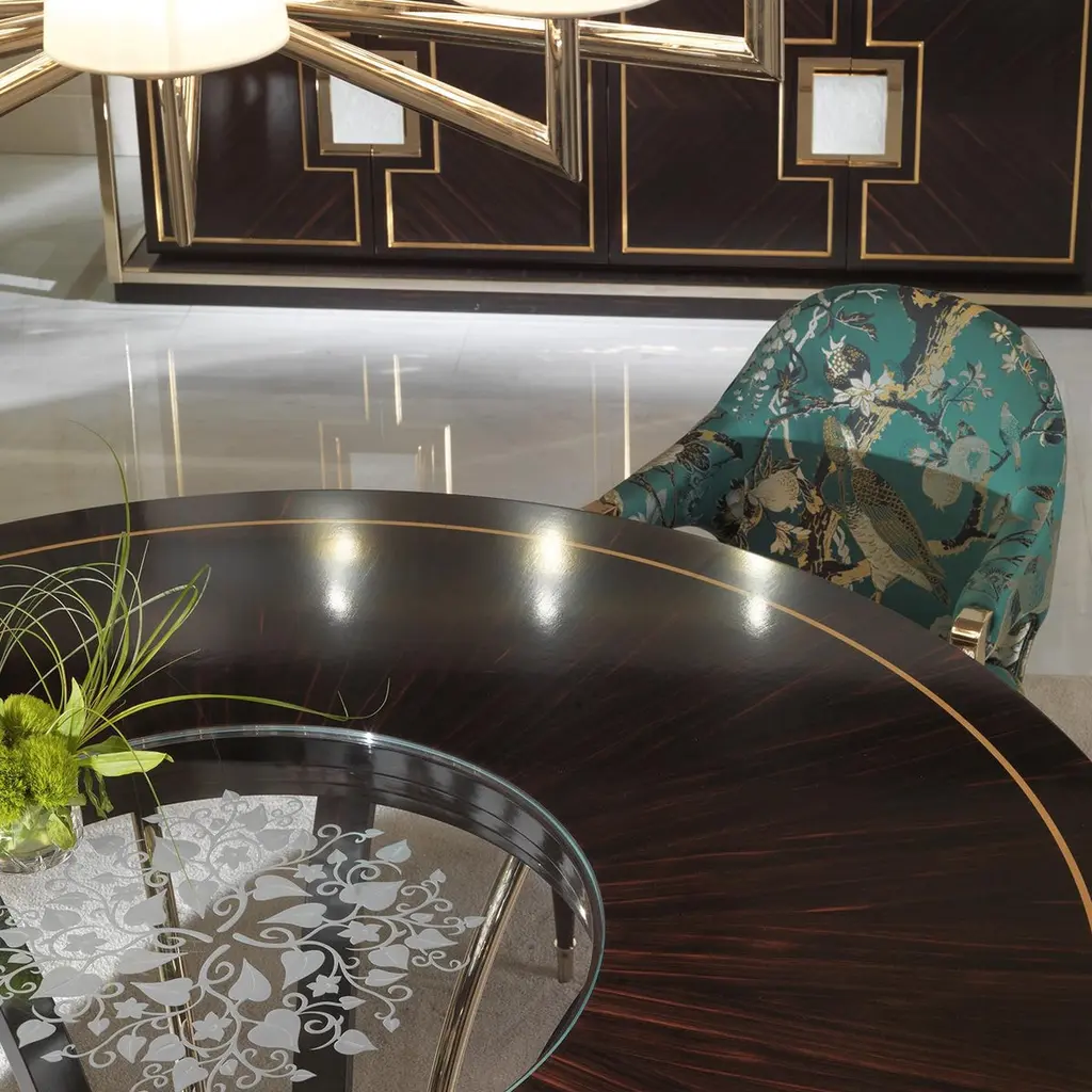 Part of a series of stunning pieces of furniture made of ebony, this round dining table is a magnificent addition to a classic home. The combination of noble materials and impeccable craftsmanship makes it a superb object that will catch the eye. Its structure in ebony with brass details comprises a round base from which curved legs stem to support the large round top, on whose center an engraved glass decoration creates unique effects, reflecting the surrounding light. It is possible to add a lazy Susan upon request.