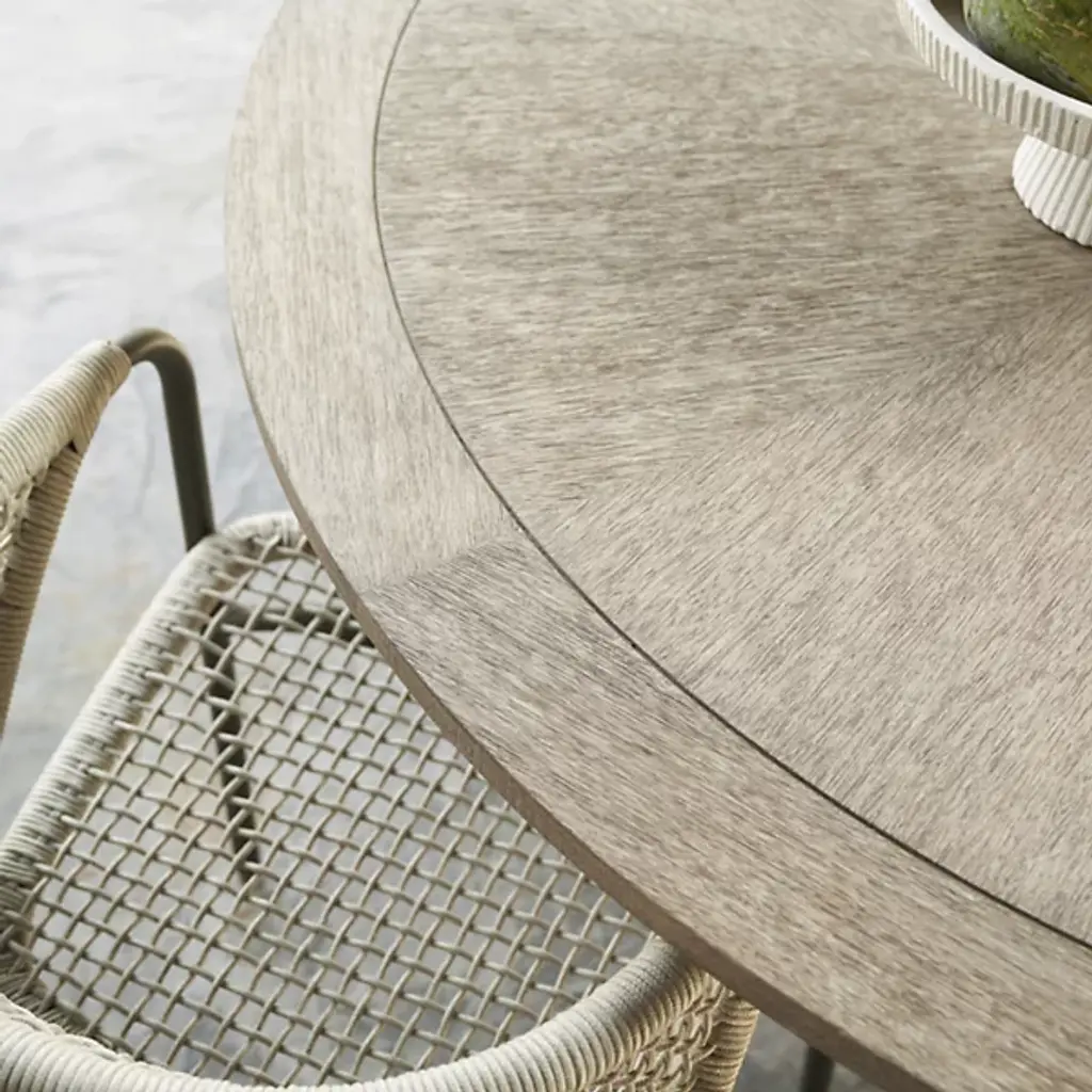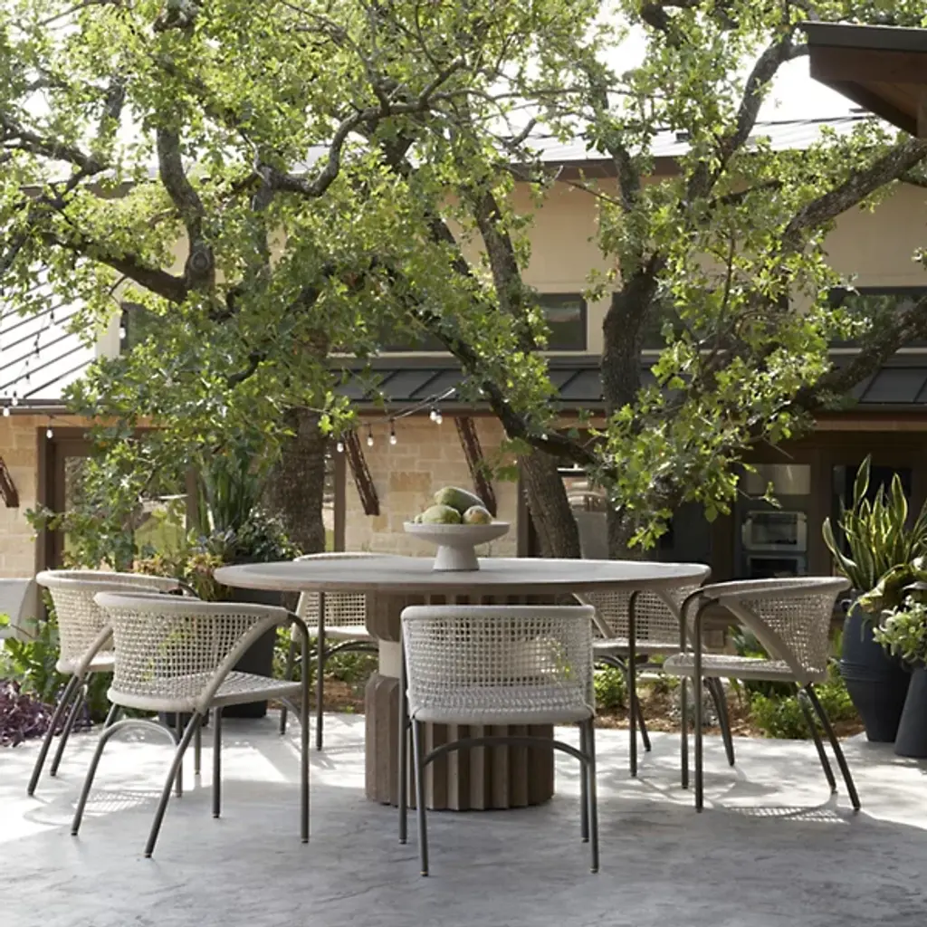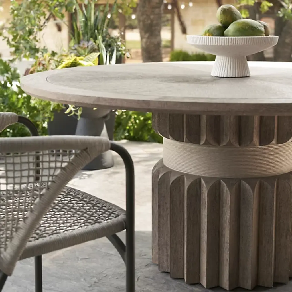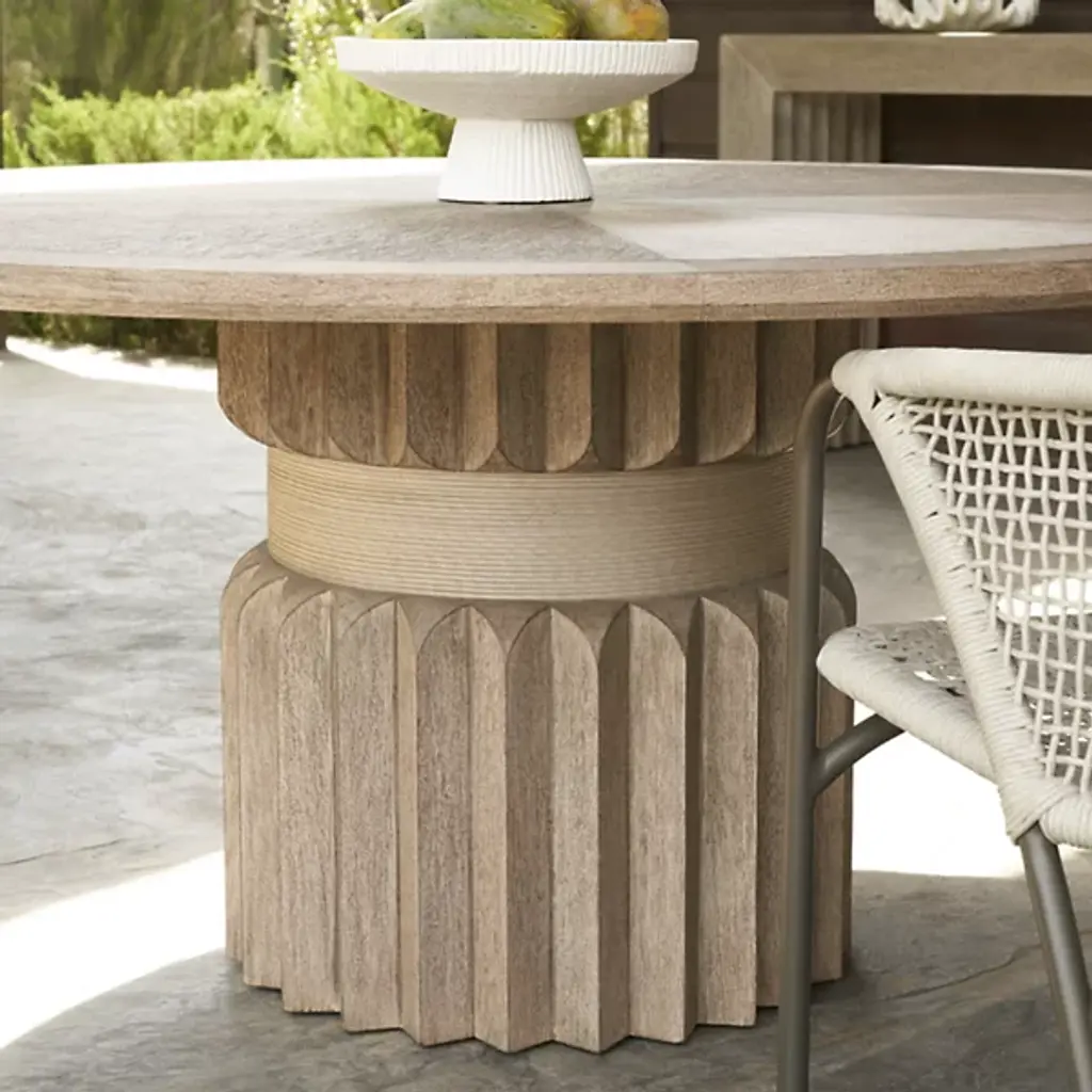 The Echo Outdoor Dining Table from Arteriors combines carved details with wrapped willow synthetic rope to create a round dining surface that balances soft and angular elements. The grade A teak veneer features a willow finish that highlights the natural wood graining, which radiates outward from the center of the tabletop. This radial grain pattern complements the pedestal base design, while synthetic rope wrapping around the base adds texture and weather-resistant properties for outdoor gatherings.
