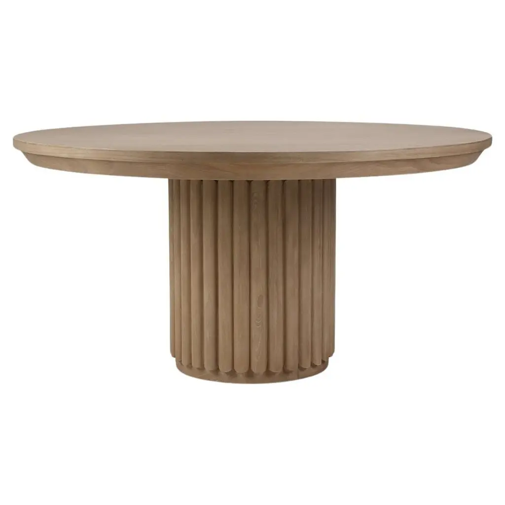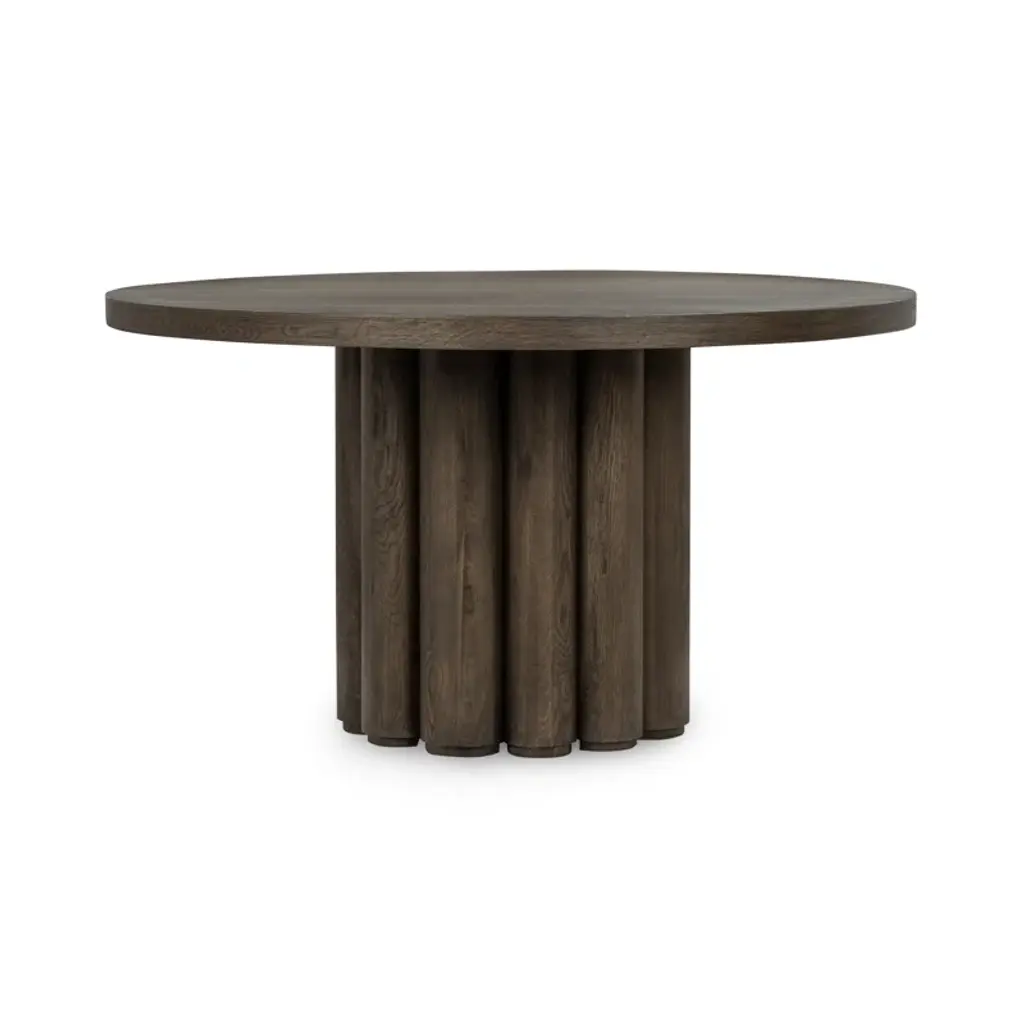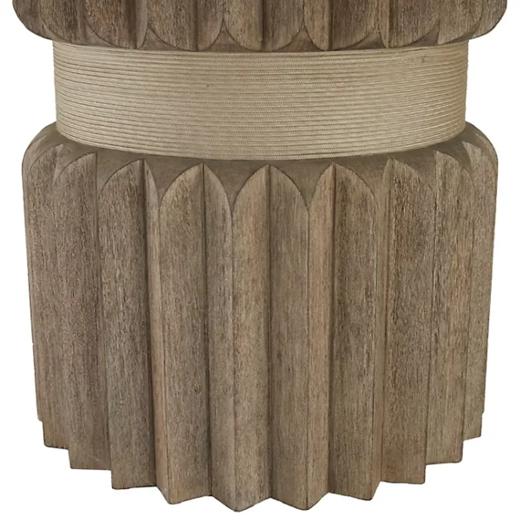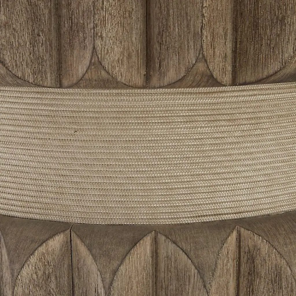 The Echo Outdoor Dining Table from Arteriors combines carved details with wrapped willow synthetic rope to create a round dining surface that balances soft and angular elements. The grade A teak veneer features a willow finish that highlights the natural wood graining, which radiates outward from the center of the tabletop. This radial grain pattern complements the pedestal base design, while synthetic rope wrapping around the base adds texture and weather-resistant properties for outdoor gatherings.