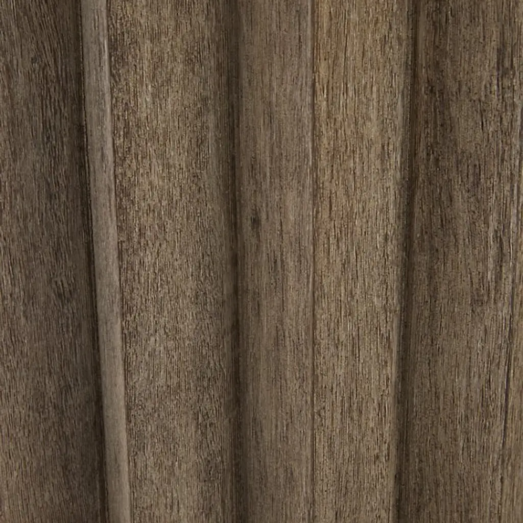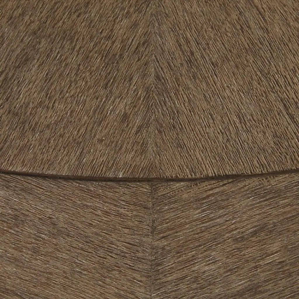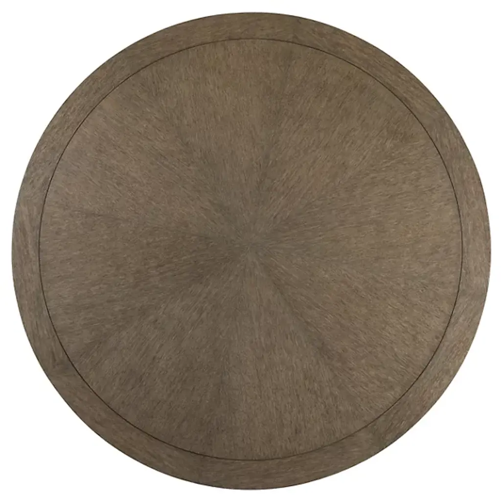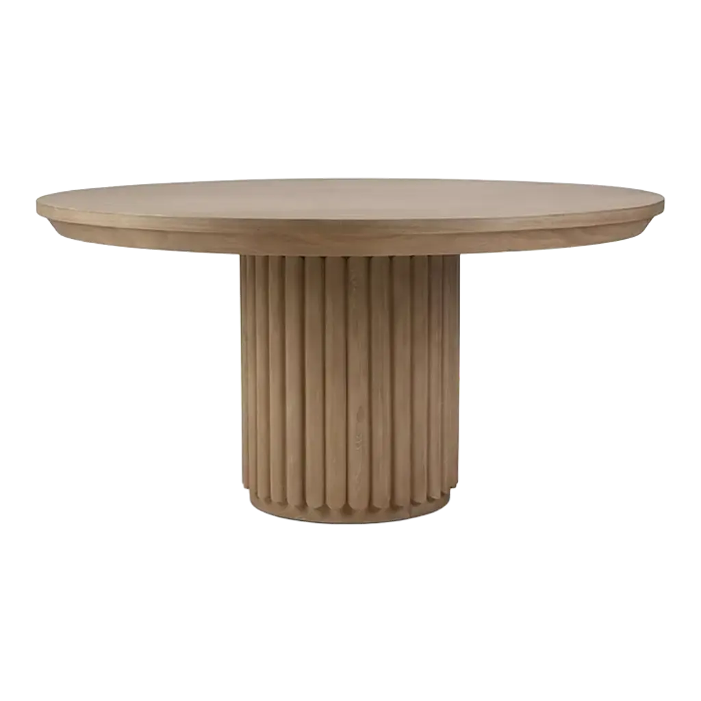The Echo Outdoor Dining Table from Arteriors combines carved details with wrapped willow synthetic rope to create a round dining surface that balances soft and angular elements. The grade A teak veneer features a willow finish that highlights the natural wood graining, which radiates outward from the center of the tabletop. This radial grain pattern complements the pedestal base design, while synthetic rope wrapping around the base adds texture and weather-resistant properties for outdoor gatherings.