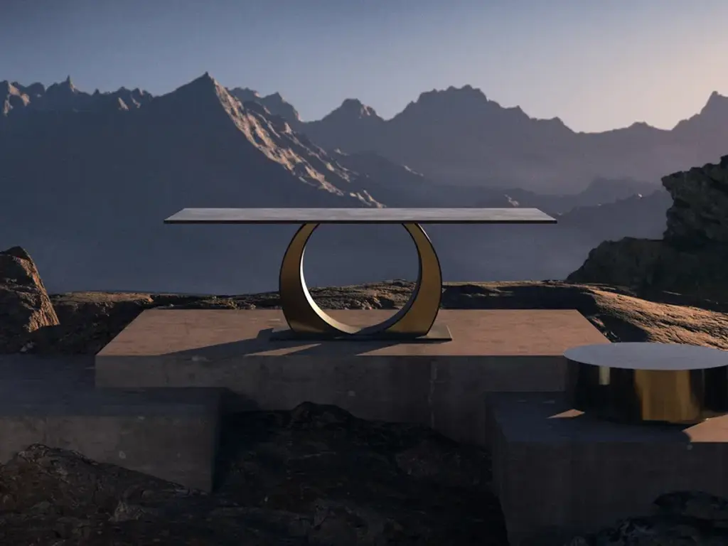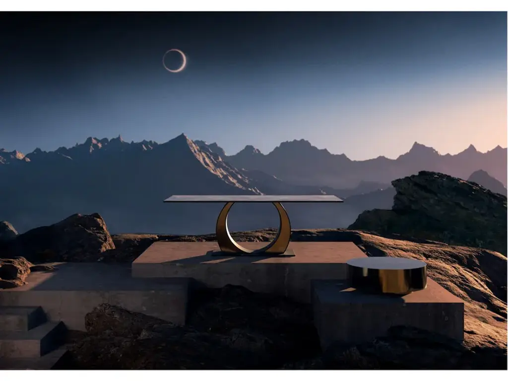 Eclipsy is an original and impactful table, it demonstrates a great personality thanks to its spatial shapes. The sturdy metal base supports the elegant Top in Quartzforms Planet Mars, Imperial White. The lunar charm also comes from the light reflected from the brushed champagne finish, which goes perfectly with the branched and rocky effect of the top, which can be customized in the size of the shapes, creating a unique and, dare we say, sensational proposal.Metal base: Dark Bronze painted, Tropical Sand paintedMetal moons: Galvanized Champagne, Galvanized Black GoldQuartzforms top: Planet Mars, Imperial White