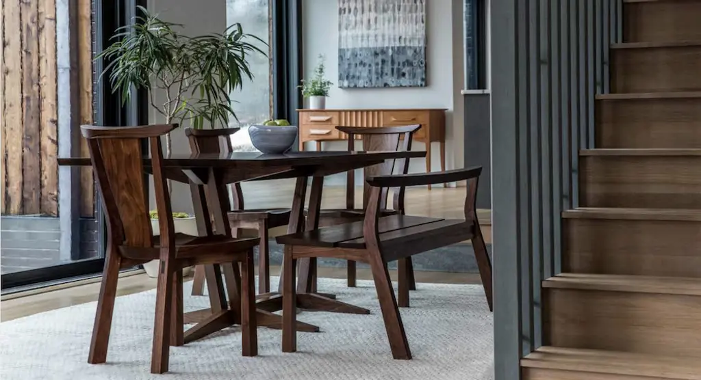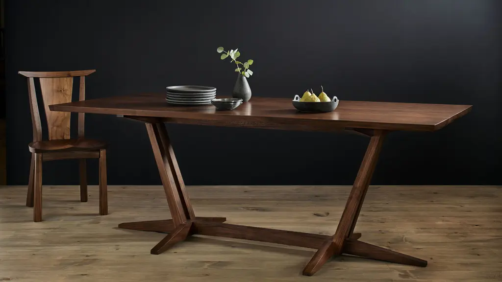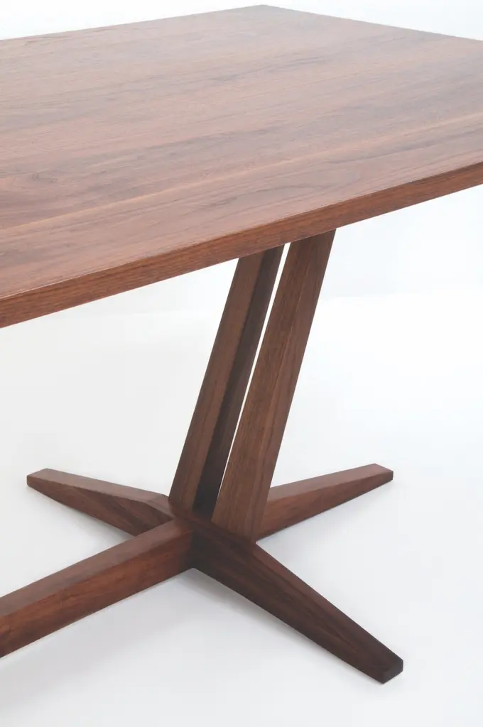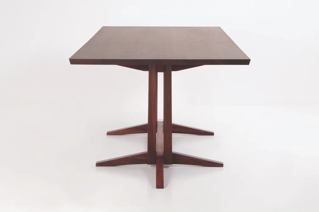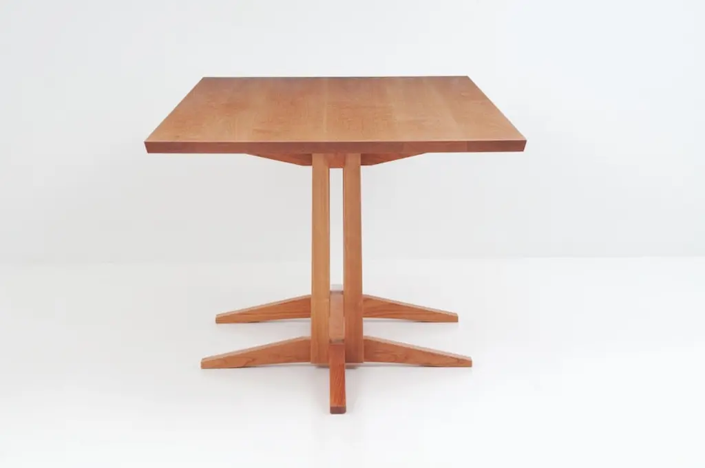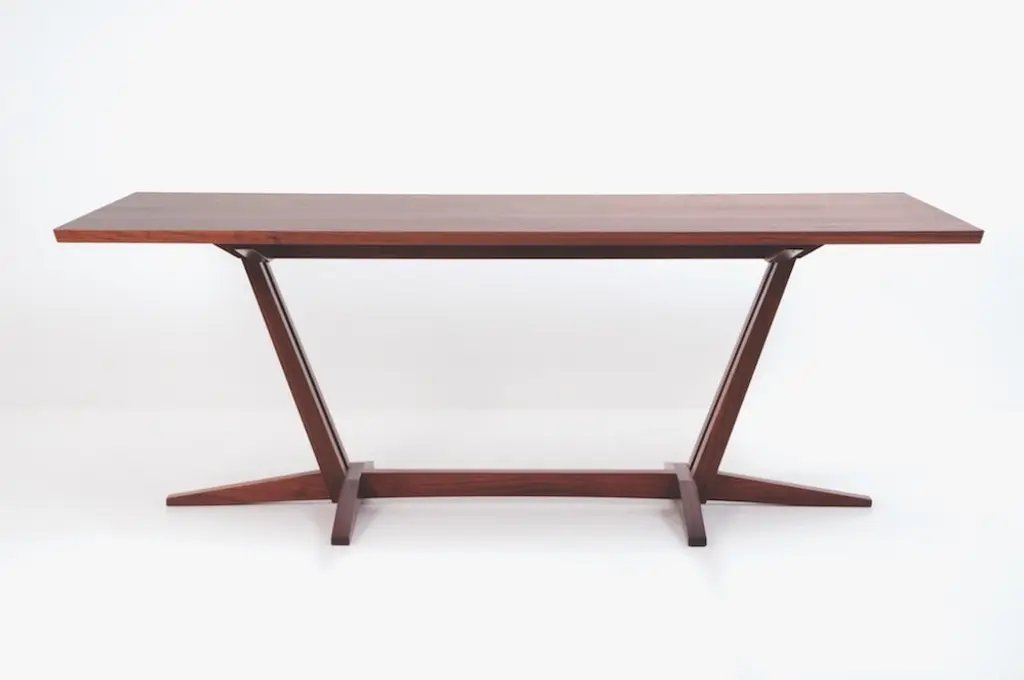 Playing with opposites like light and shadow, space and substance, the Edo Trestle Table brings all to rest in one satisfying whole. A broad cherry or walnut surface ranging from six to over eight feet in length lies upon a unique trestle leg configuration, grounding the table without adding bulk. Inspired by the work of Japan’s Edo-period craftspeople, the table forms an elegant centerpiece and a practical addition to any dining area.