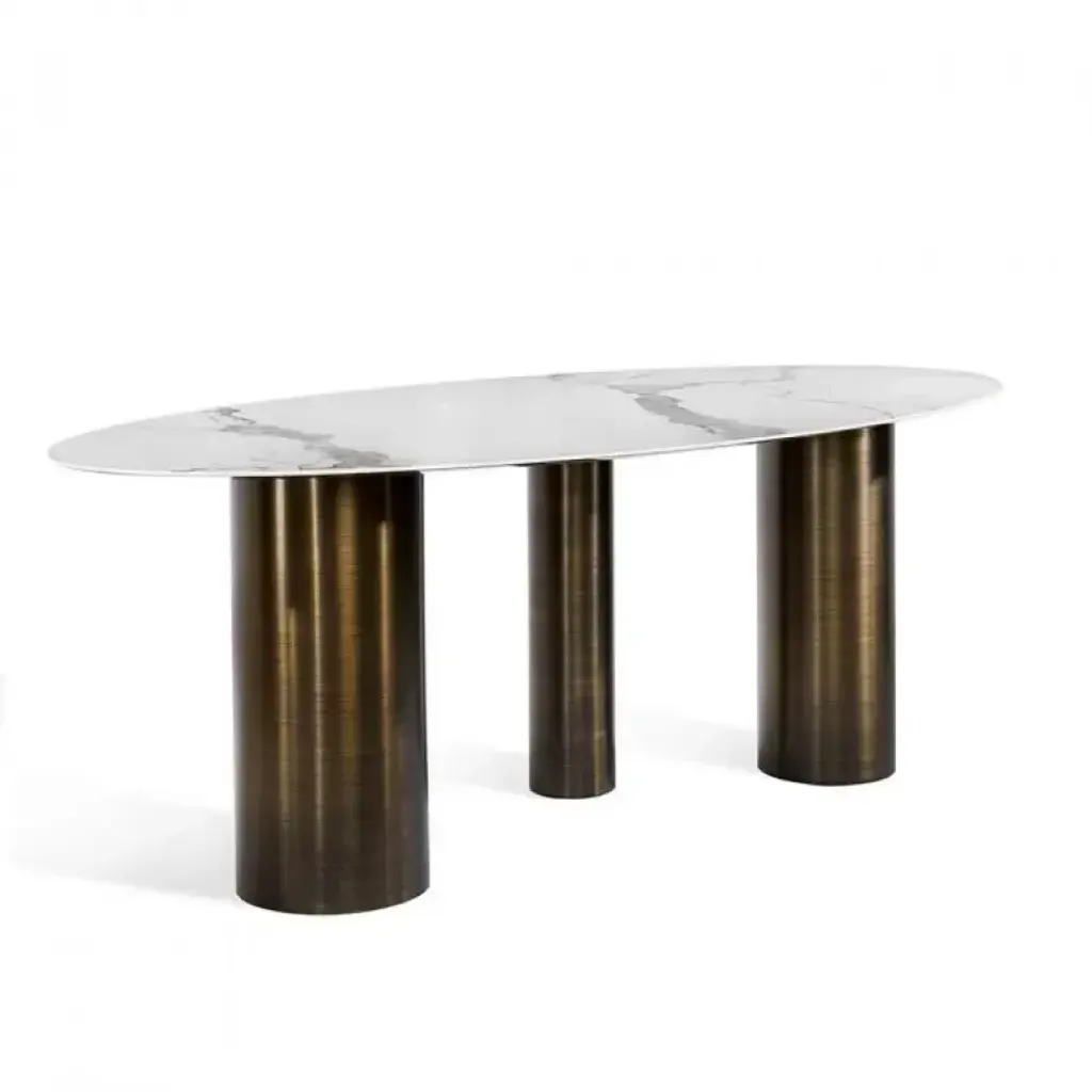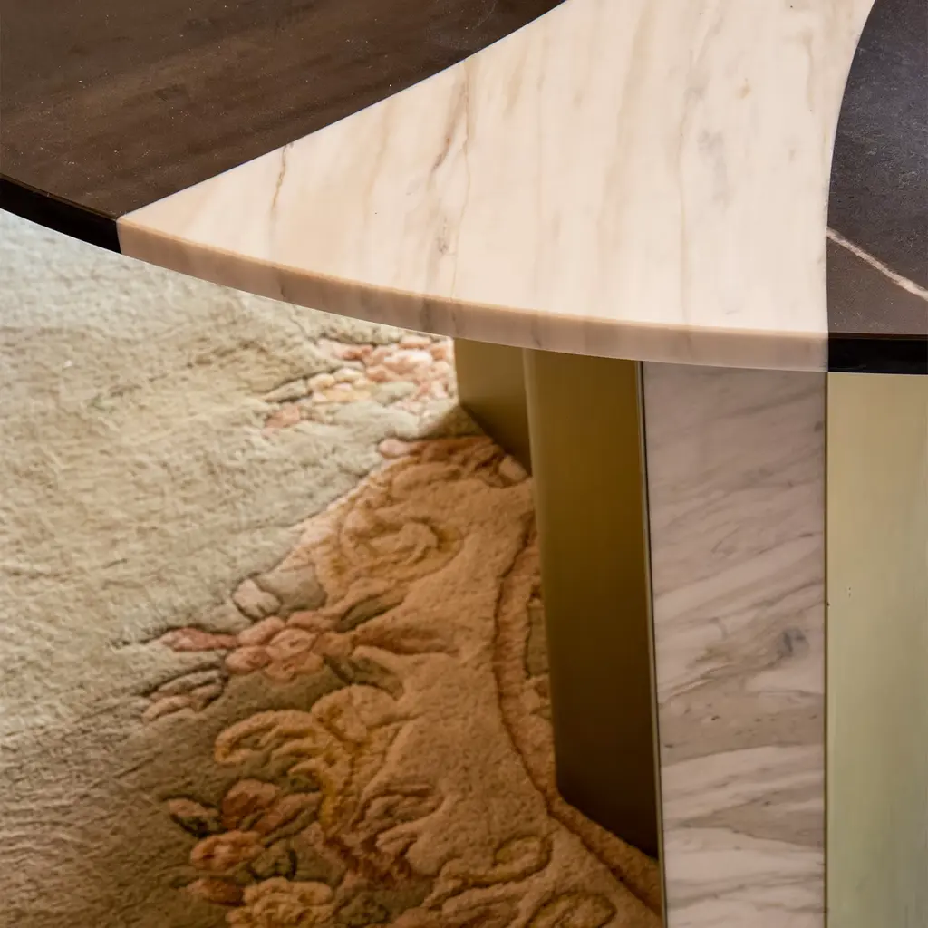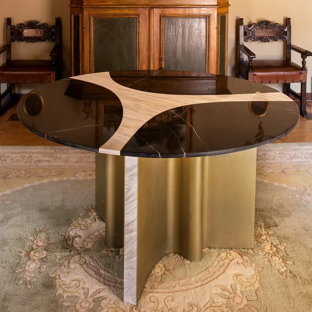 This dining table’s elegant silhouette merges sculpture with design. Three Calacatta Ondulato pillars support the round top, which is inlaid with a pattern of Calacatta Ondulato and Sahara marbles. The top pattern follows the shape of the base, made of metal sheets welded together. The base is in winter gold satin finish. The marble's interplay of colors and textures creates a dramatic graphic contrast. Please, contact the Concierge for customization options. Due to the nature of the material, the product may slightly vary.