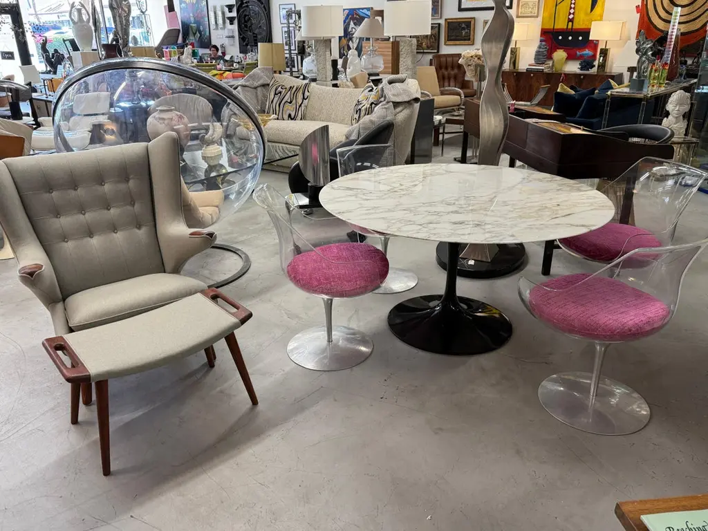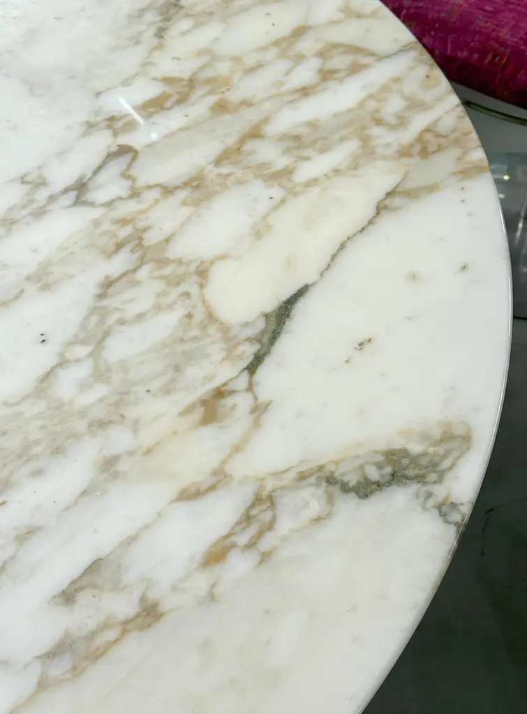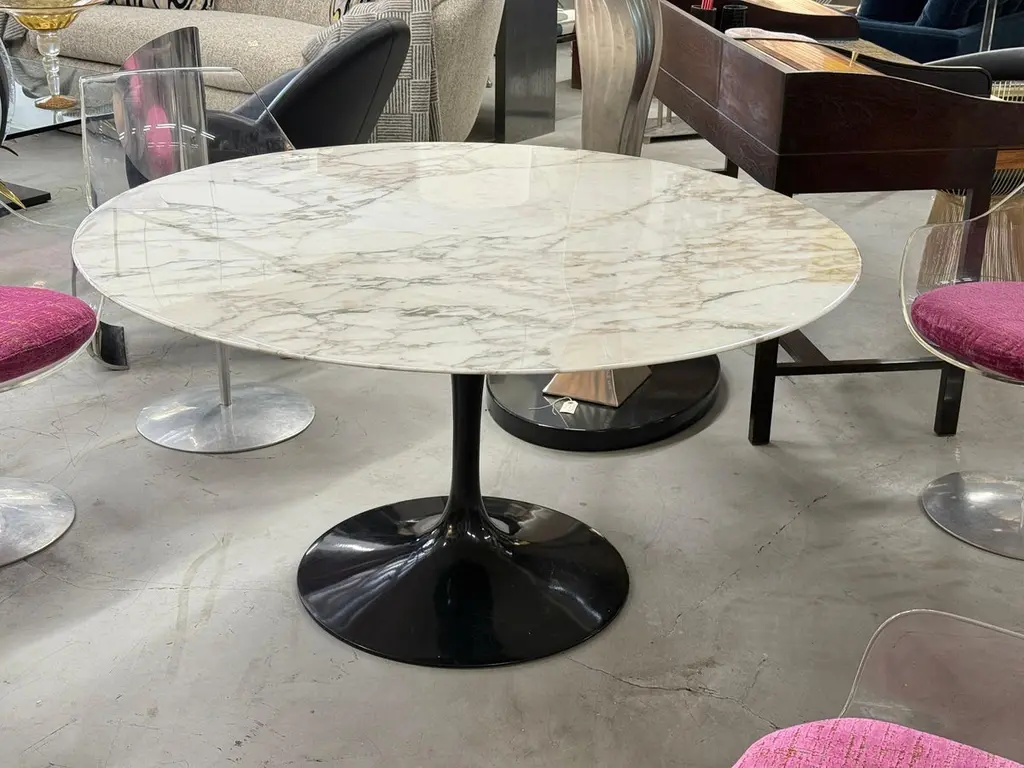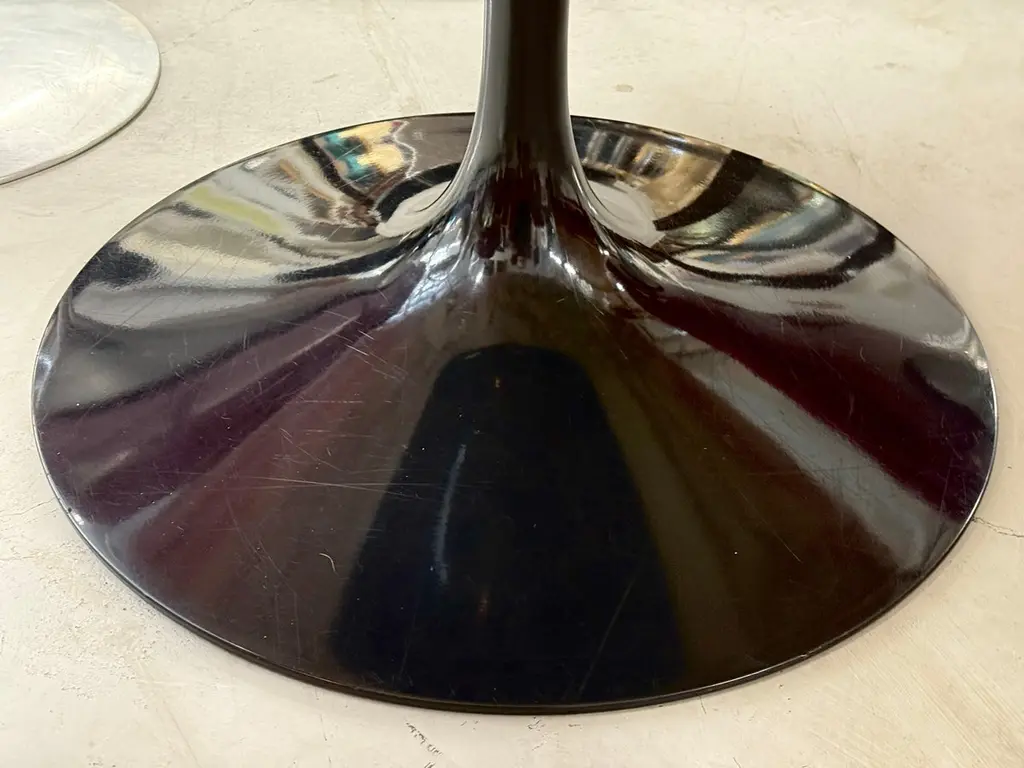 A classic design by Eero Saarinen for Knoll, this Tulip Pedestal table features a white marble top with a black base. It’s a nice contrasty color combination. The top is beautifully veined and figured. It’s 54” in diameter. The top has scratches in the lacquer finish as is common from use. The black base has some scratches as well, please see the detailed pictures.It is marked Knoll on the base and it bears the Knoll studios label on the top underside.