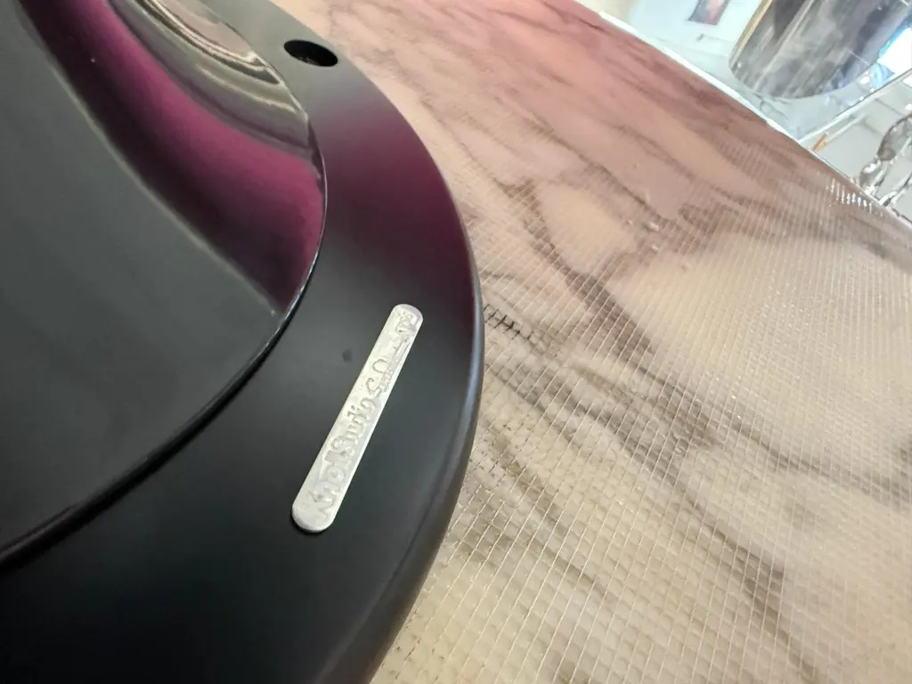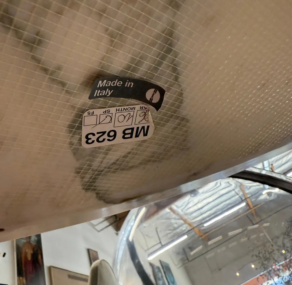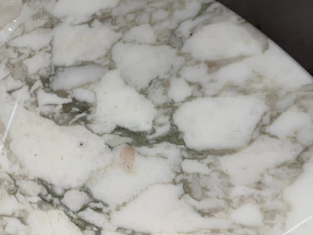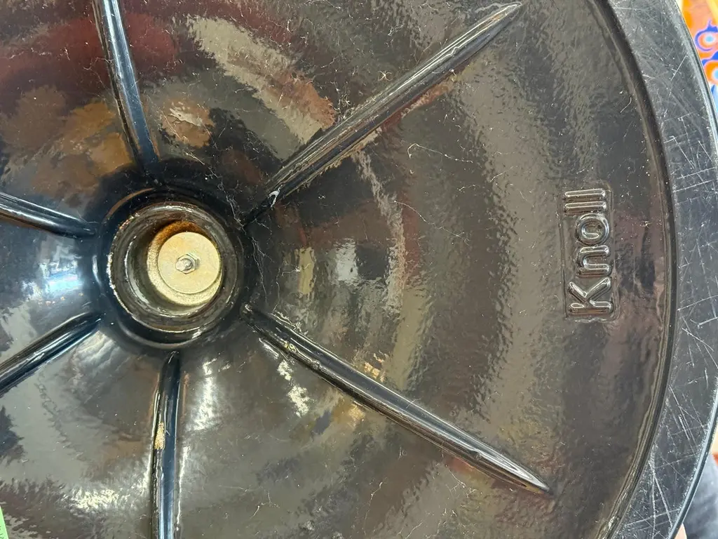 A classic design by Eero Saarinen for Knoll, this Tulip Pedestal table features a white marble top with a black base. It’s a nice contrasty color combination. The top is beautifully veined and figured. It’s 54” in diameter. The top has scratches in the lacquer finish as is common from use. The black base has some scratches as well, please see the detailed pictures.It is marked Knoll on the base and it bears the Knoll studios label on the top underside.