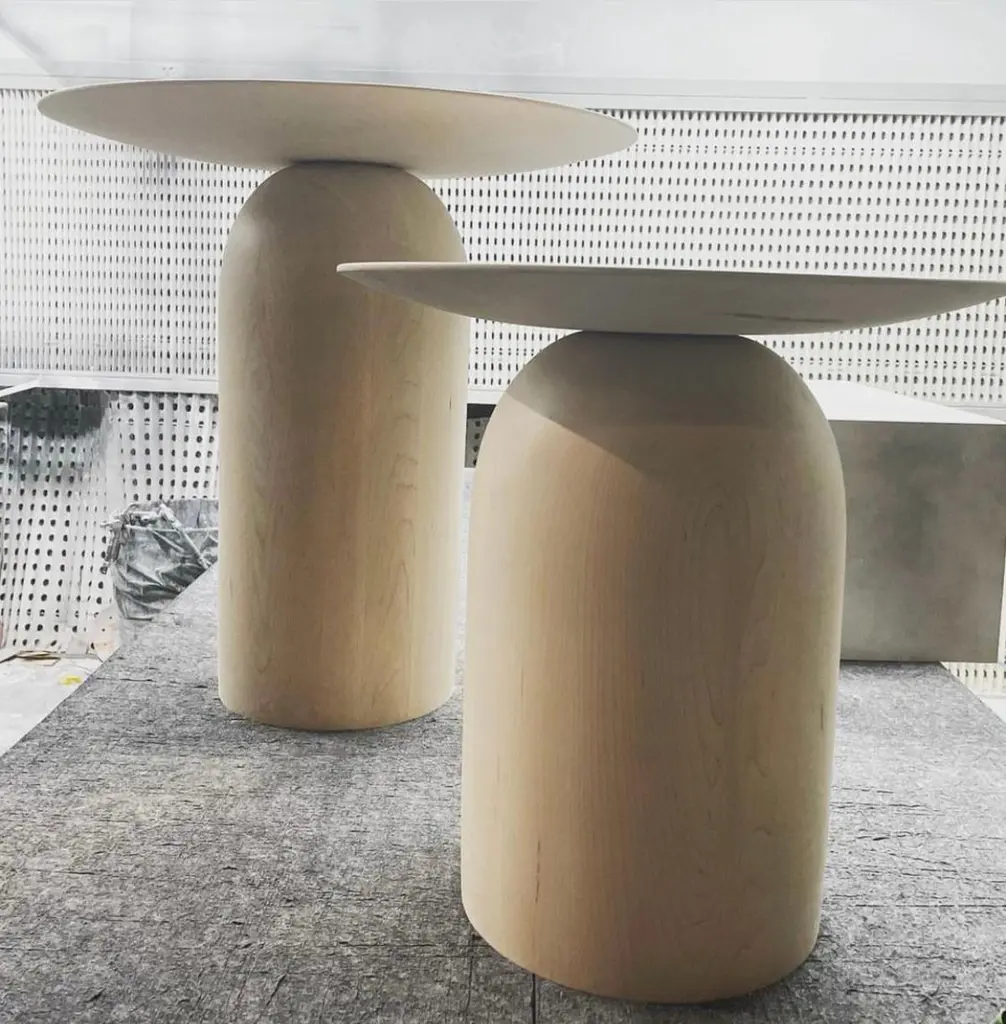 This EGG center hall table was first made to be a central piece in a recent, AD feature, pictured here. Our much copied EGG tables are customizable in sizes from small to double base dining tables and everything in between. All of our truly artisanal, minimal EGG Tables are made by hand on a single lathe by master craftspeople in Australia. Inspired by the sculpture and paintings of Jean Arp, this version is 36" diameter b 26" high. At 30" this table can seat four for dining or as a reception or meeting table. At any size our EGG tables add a sculptural feature to furnished spaces enhancing almost any decor. All of our pieces are made one at a time with hand selected sustainable timbers and proprietary finishing techniques. This one is made of rock maple with our signature, hand-tinted and sustainable matte Scandinavian blond finish. We develop new size variations carefully to ensure beautiful proportions for all of our EGG Tables and all of our other designs. Please get in touch to discuss your requirements from a small EGG side table to EGG dining size and larger.