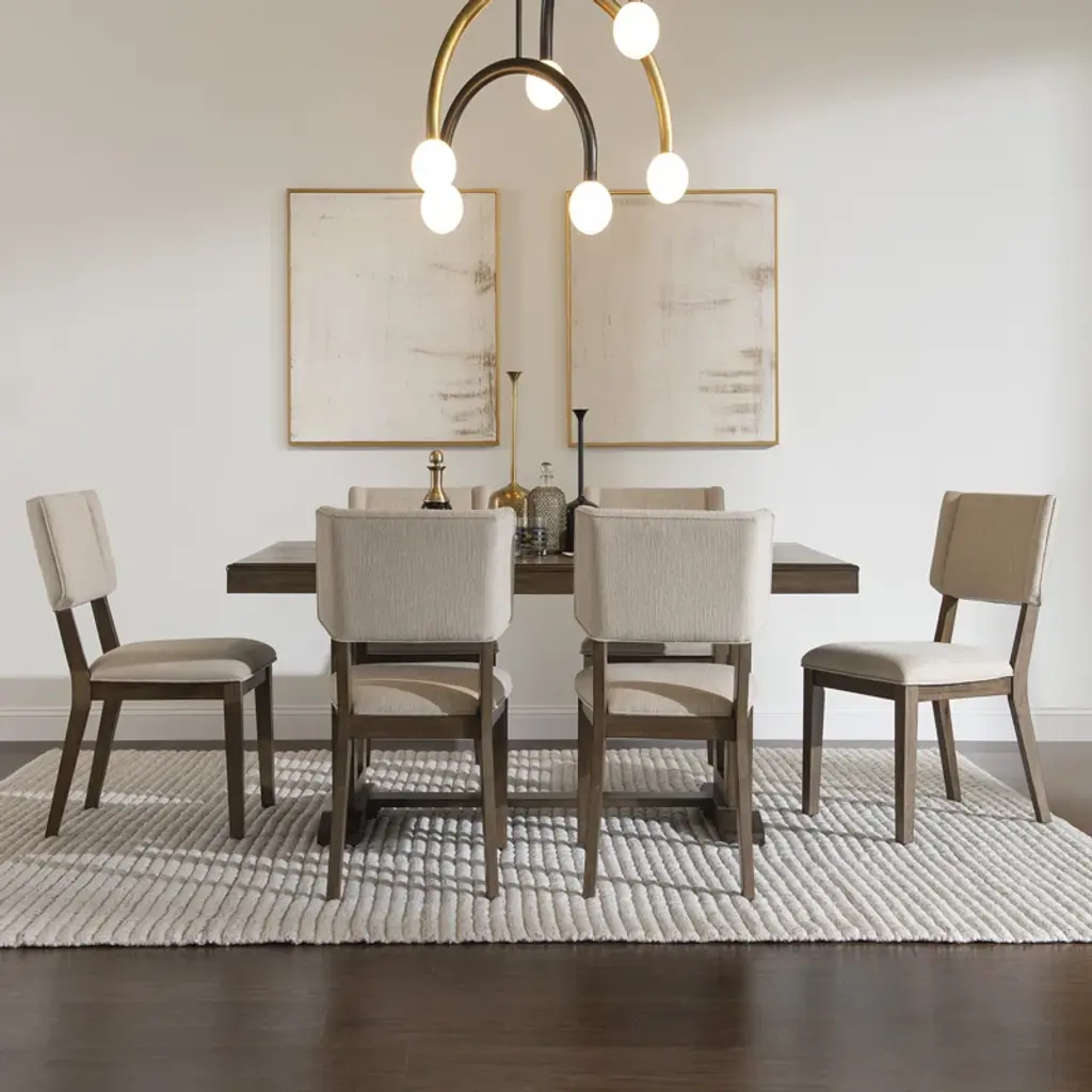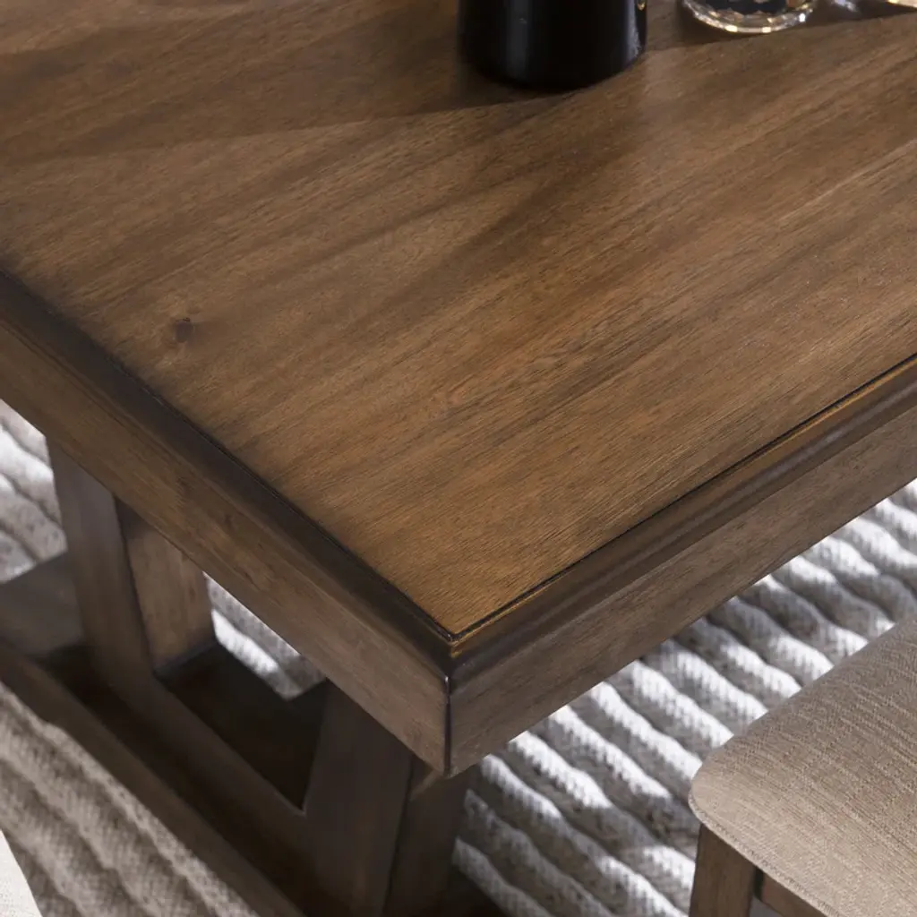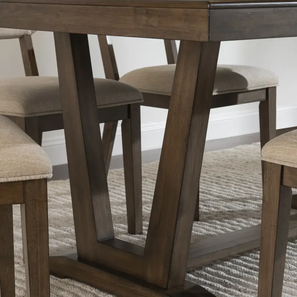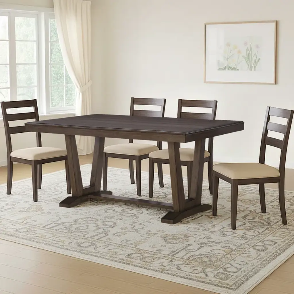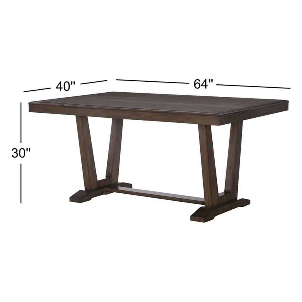 Clean lines and a traditional rectangular surface make this dining table stand out from the rest. It's made from solid wood with an inviting finish of An open trestle base includes two tinverted triangle legs and a crossbar that rests flush against the floor for additional stability. This panel tabletop design measures and seats people around it comfortably. Compatible chairs and benches are sold separately. Some assembly is required