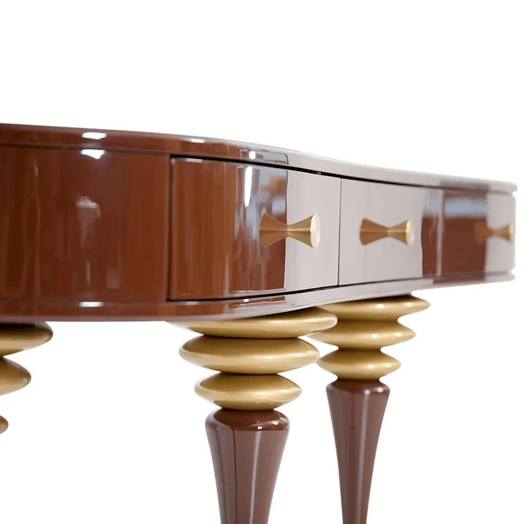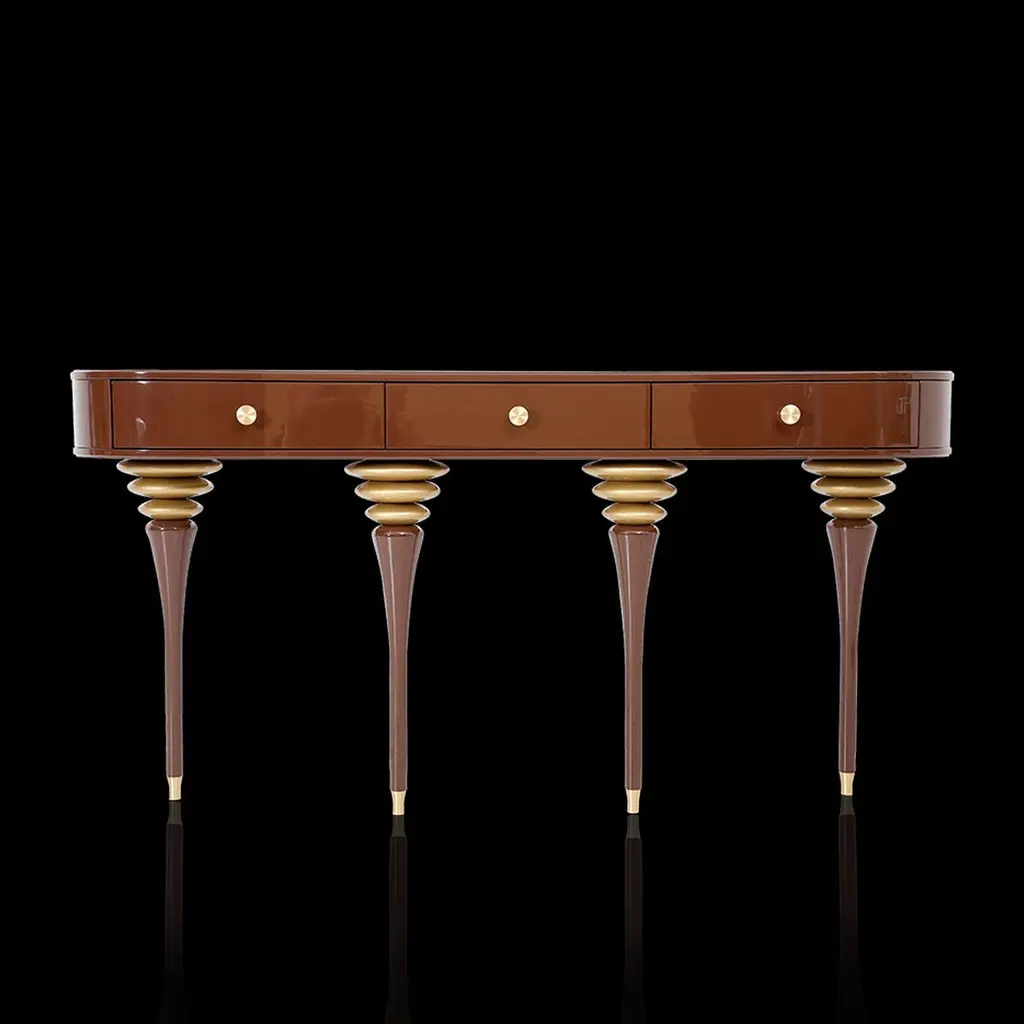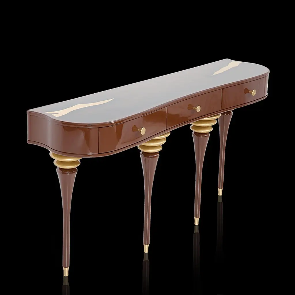Exclusive console inspired by traditions of One Thousand and One Nights. Available in a curated selection of fashionable finishes, this elegant console table is crafted of solid wood finished in high gloss and supported by elegant legs. Triple red lined drawers are ideal for displaying your finest jewelry or little things, while the eye-catching brass pulls offer eclectic look. Rounding out the design, the exclusive top surface with brass inlays has enough space to display a vase with flowers, framed photos, and a stylish lamp.Place the console in entrance hall, the foundation for a stylish vignette to greet visitors, but it can also be a smart addition to a living or dining room, where it can act as both extra storage and a stylish surface for display. Kanttari invites you to experience a perfect blend of modernity, the finest materials, hand made quality and stunning design.CUSTOMIZATION AVAILABLE - Different colors, materials, finishes and customized sizes available upon request. If you’re interested in a customization that is not currently listed, please contact Kanttari.BESPOKE – We do create individual and fully customized designs. Please contact Kanttari to discuss your specifications.MANUFACTURING – we fully hand-craft each piece in our workshop by our best craftsmen. Production lead time may take up to 9 - 12 weeks, bespoke items may be longer – depending on the exact specification and availability of materials chosen. For more information please contact Kanttari.SHIPPINGCarefully packaged in wooden crate.Fully insured.Request a customized shipping quote.