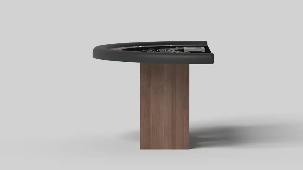 Supported by two rectangular open pedestals as the base, the Ambrosia blackjack table is modern and minimalistic with its combination of simple, geometric forms. Viewed from the front, the use of negative space is evident; viewed from the side, the base appears to be one solid form. A semicircular top frames the impeccable game surface, allowing for the perfect combination of superior playability and irrefutable style.Size:88”X46”X30” (Dining Height)Custom Sizes Available Per Request