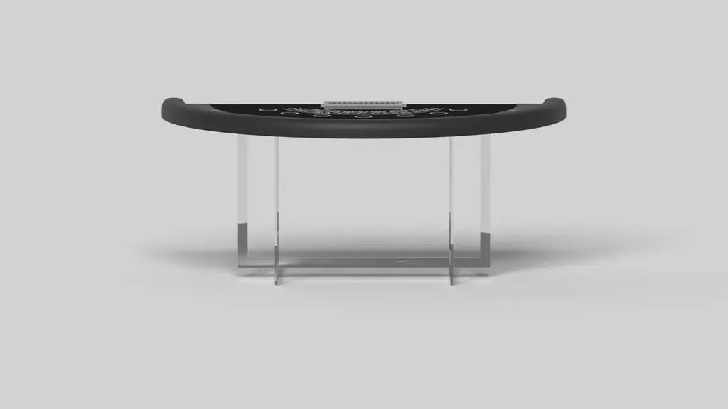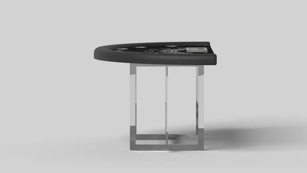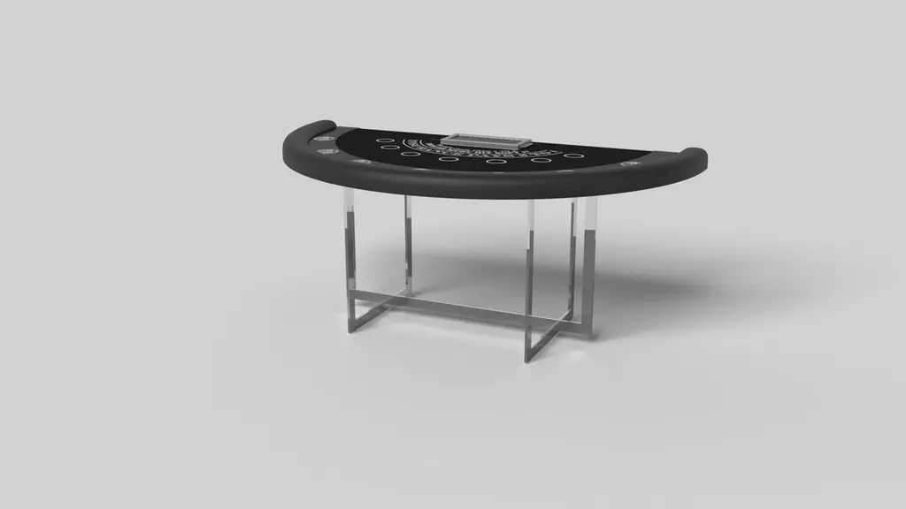 With an open metal foundation, our Beso table is a unique expression of contemporary forms and negative space. This blackjack table is handcrafted by our master artisans with a rectangle-in-rectangle base that echoes the angles and edges of a regulation game top. The aesthetic is simple yet sleek, combining superior playability with uncompromised style.Size:88”X46”X30” (Dining Height)Custom Sizes Available Per Request