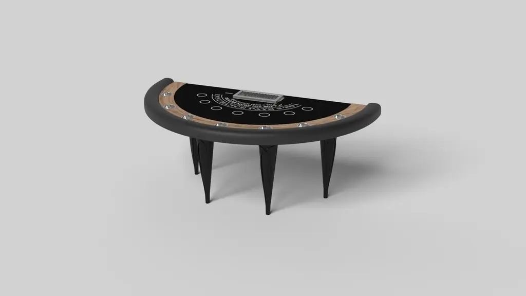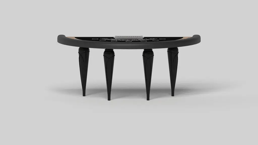 Champagne gold accents add undeniable elegance to this luxury blackjack table. Offering superior playability and uncompromised style, this design features hand carved details, decorative metal elements, and metal sabots at the bottom of each leg. The side skirts are artfully trimmed to create the high and low texture of crown molding, providing a beautiful contrast against the smooth, tapered legs. With its distinctive combination of form and function, this blackjack table is a noteworthy addition to any room.Size:88”X46”X30” (Dining Height)Custom Sizes Available Per Request