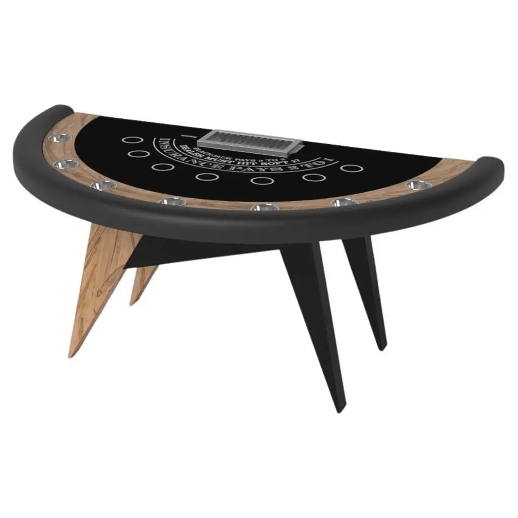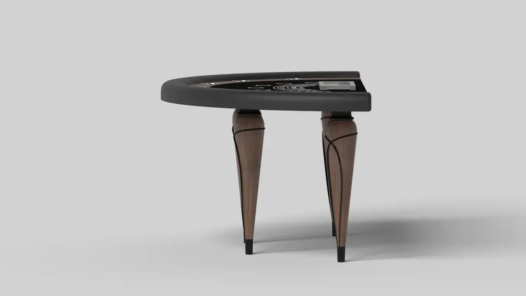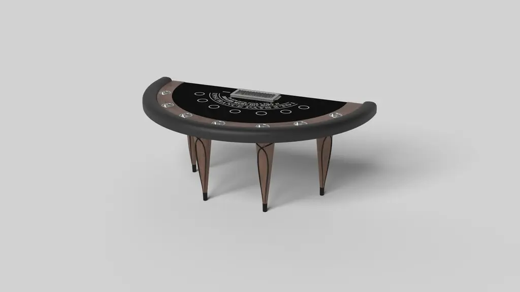 Champagne gold accents add undeniable elegance to this luxury blackjack table. Offering superior playability and uncompromised style, this design features hand carved details, decorative metal elements, and metal sabots at the bottom of each leg. The side skirts are artfully trimmed to create the high and low texture of crown molding, providing a beautiful contrast against the smooth, tapered legs. With its distinctive combination of form and function, this blackjack table is a noteworthy addition to any room.Size:88”X46”X30” (Dining Height)Custom Sizes Available Per Request