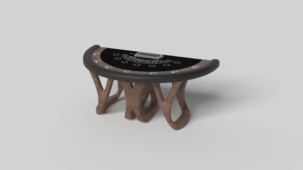 Inspired by the work of Antoni Gaudi and the movement of Catalan Modernism, the Draco blackjack table in walnut boasts bold style with smooth, curved legs and a casino-grade table top with a chip rack and betting circles for professional game play. Expertly crafted from top to bottom, this table features a high-end, contemporary design in a smooth walnut finish.Size:88”X46”X30” (Dining Height)Custom Sizes Available Per Request