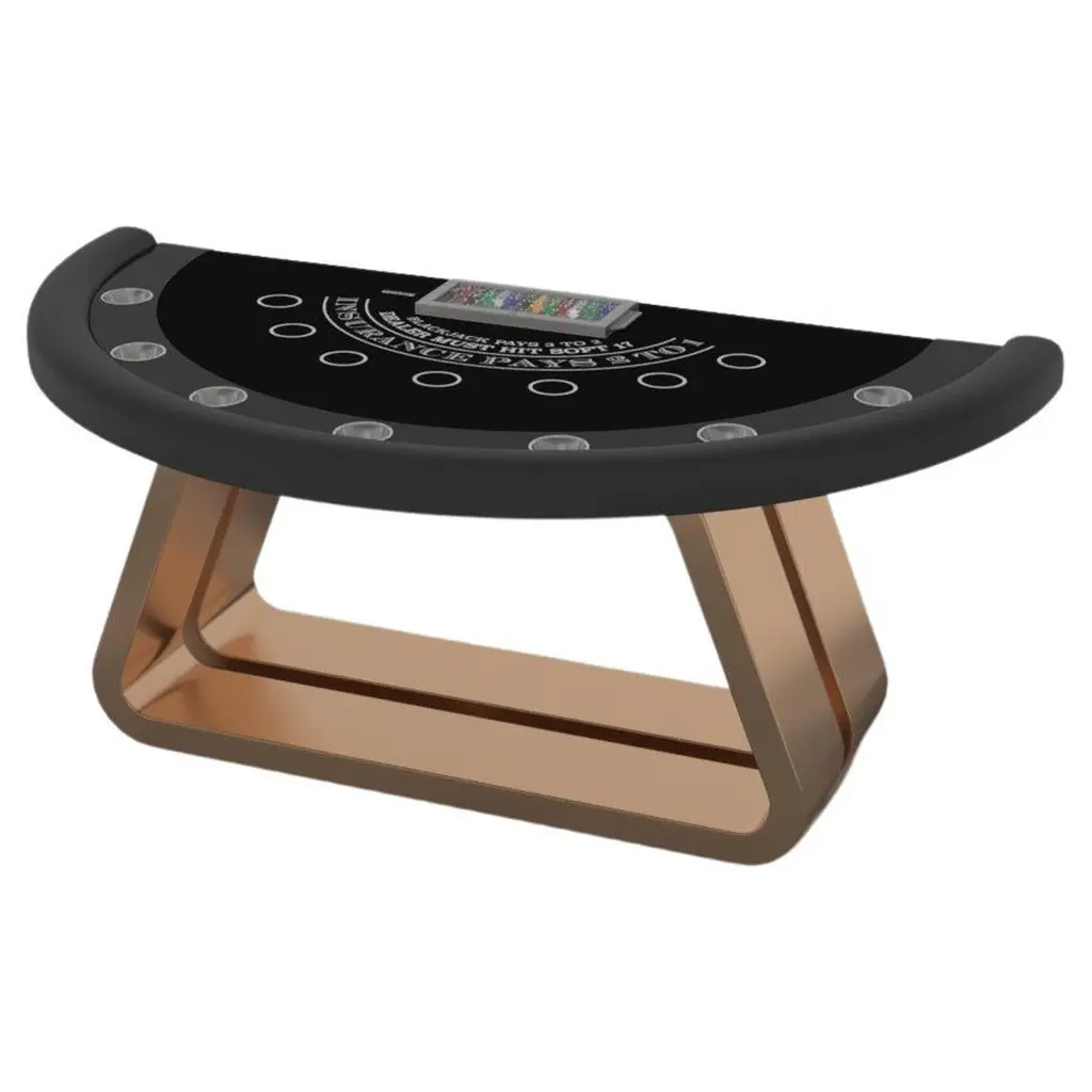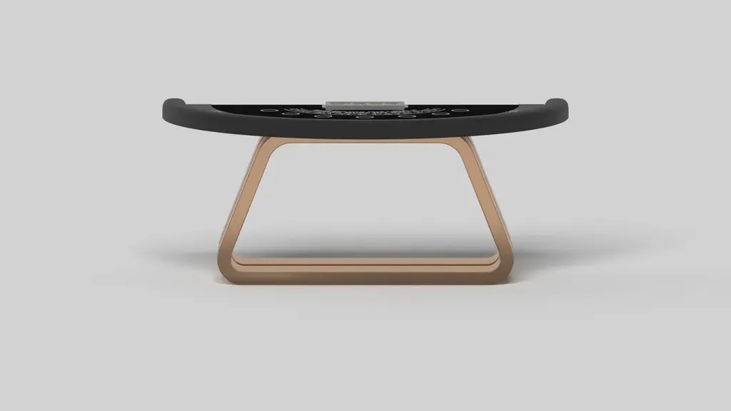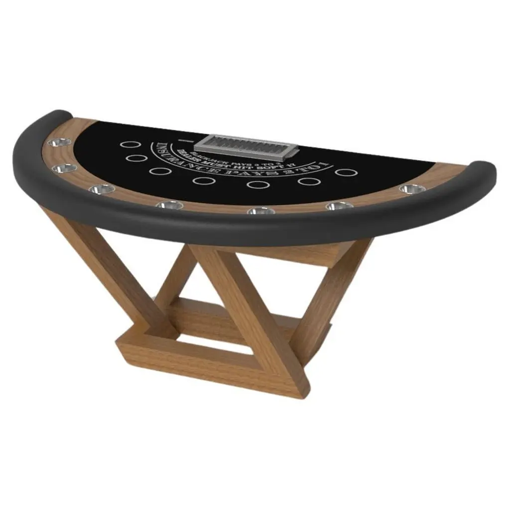 An open base with sweeping curves and smooth edges imparts a light, airy feel upon the Luge blackjack table in walnut. Evoking a sense of speed and the spirit of continuous movement, this exclusive game table features a split base with open sides and a semicircular table top that counterbalances the infinite curvature of the rounded base. The top is beautifully detailed with a chip rack and betting circles that encourage hours of endless game play.Size:88”X46”X30” (Dining Height)Custom Sizes Available Per Request