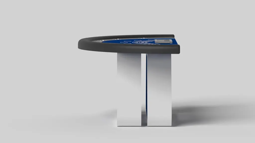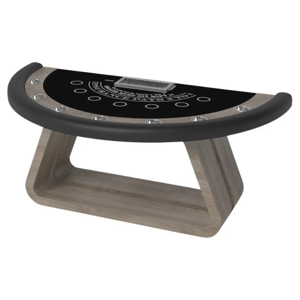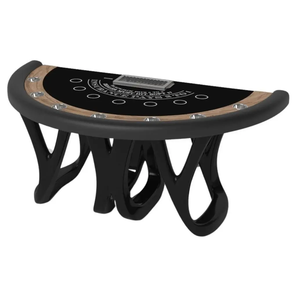 An open base with sweeping curves and smooth edges imparts a light, airy feel upon the Luge blackjack table in walnut. Evoking a sense of speed and the spirit of continuous movement, this exclusive game table features a split base with open sides and a semicircular table top that counterbalances the infinite curvature of the rounded base. The top is beautifully detailed with a chip rack and betting circles that encourage hours of endless game play.Size:88”X46”X30” (Dining Height)Custom Sizes Available Per Request