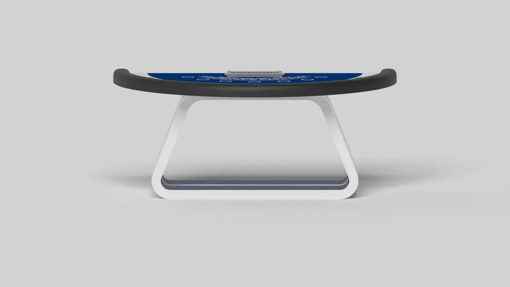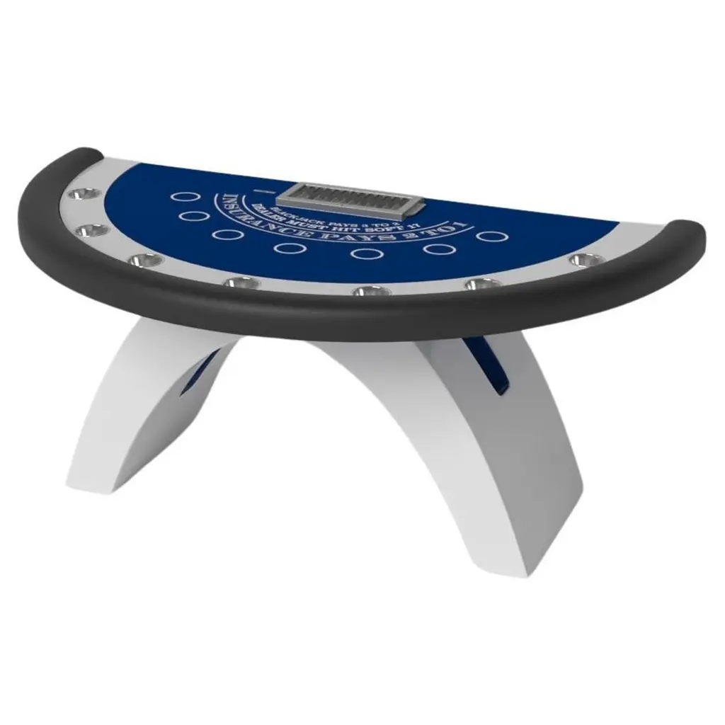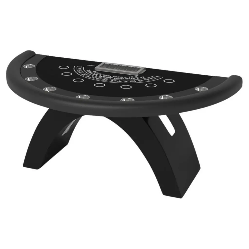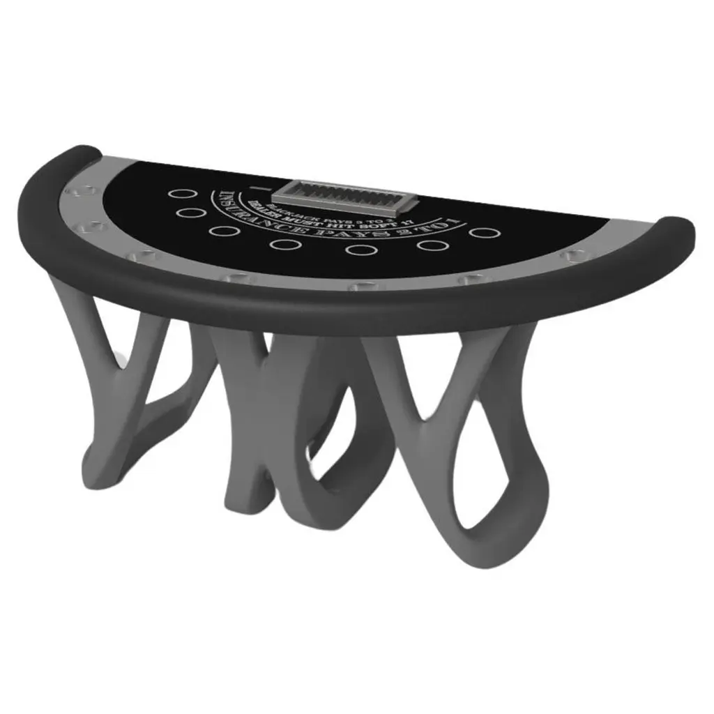 An open base with sweeping curves and smooth edges imparts a light, airy feel upon the Luge blackjack table in walnut. Evoking a sense of speed and the spirit of continuous movement, this exclusive game table features a split base with open sides and a semicircular table top that counterbalances the infinite curvature of the rounded base. The top is beautifully detailed with a chip rack and betting circles that encourage hours of endless game play.Size:88”X46”X30” (Dining Height)Custom Sizes Available Per Request