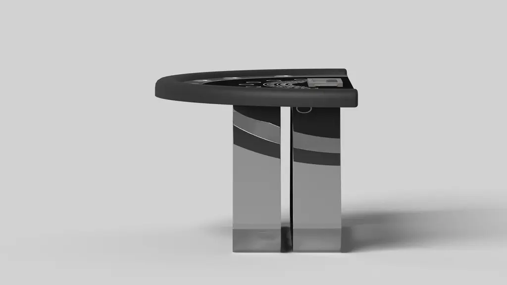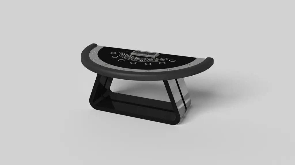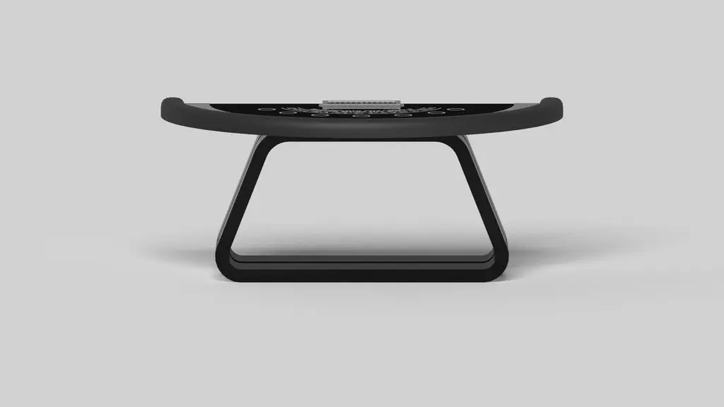 An open base with sweeping curves and smooth edges imparts a light, airy feel upon the Luge blackjack table in walnut. Evoking a sense of speed and the spirit of continuous movement, this exclusive game table features a split base with open sides and a semicircular table top that counterbalances the infinite curvature of the rounded base. The top is beautifully detailed with a chip rack and betting circles that encourage hours of endless game play.Size:88”X46”X30” (Dining Height)Custom Sizes Available Per Request