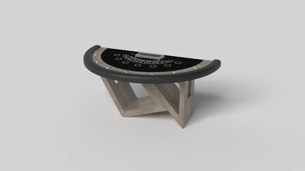 Drawing inspiration from the beauty of geometric forms, the Rumba blackjack table in brushed aluminum is characterized by a series of hollow and solid shapes that form an offset asymmetric base. Accented with a chip rack and betting circles for professional game play, this custom table features a high-end designer appeal that coordinates seamlessly into any modern room design.Size:88”X46”X30” (Dining Height)Custom Sizes Available Per Request